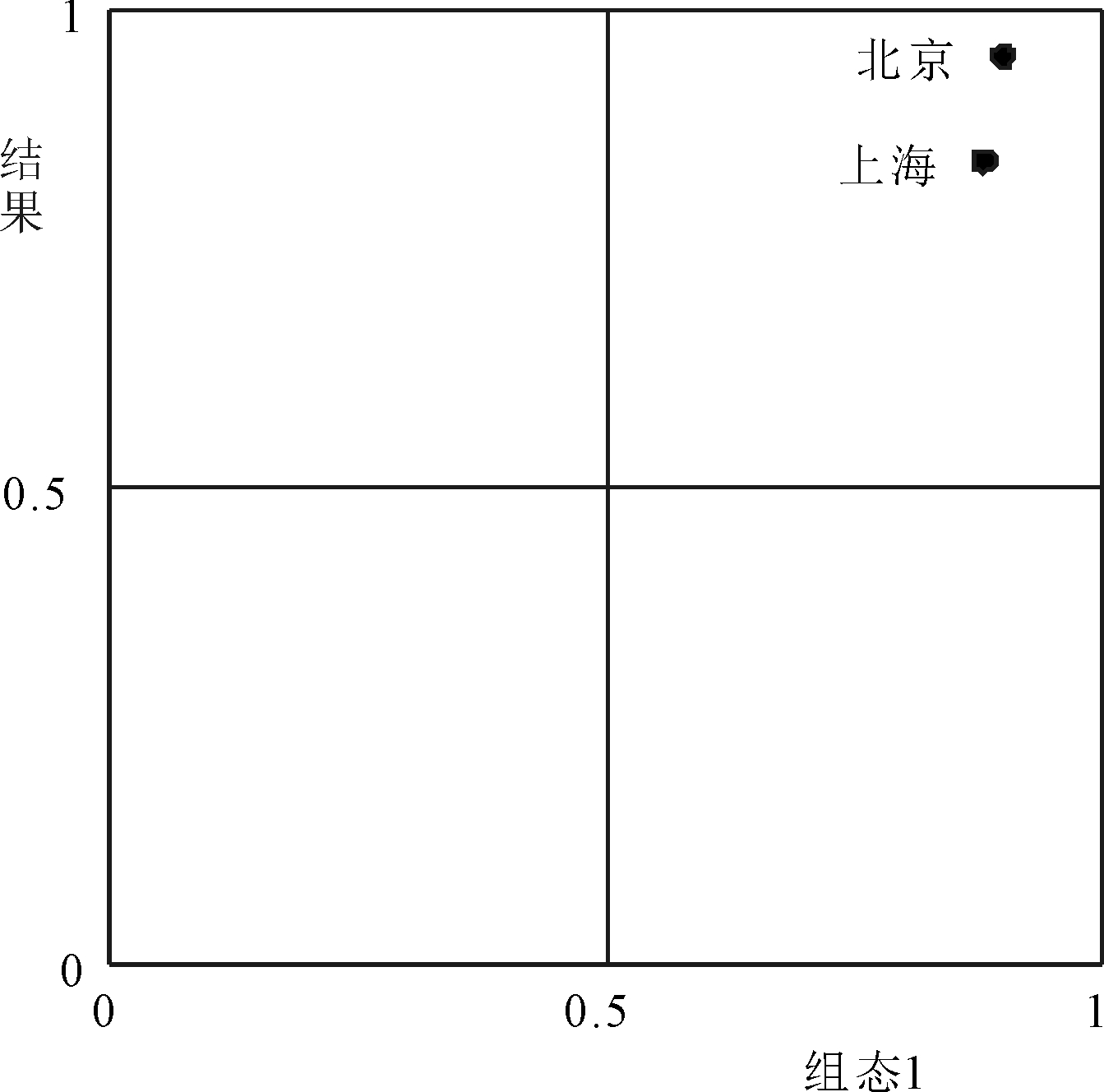 为划分不同区域创新链耦合协调发展等级,参考杜德林等[32]的分类方法,将耦合协调度D值划分为4个等级:当0.8 根据条件组态分析要求,需检验单个条件变量是否构成影响区域创新链耦合协调度的必要条件,若条件变量的一致性均小于0.9,表明前因条件未达到必要条件标准[33]。如表4所示,在对区域创新链高度耦合协调必要条件的分析中,未出现一致性大于0.9的条件变量;在对区域创新链低度耦合协调必要条件的分析中,低数字化技术水平的一致性高于临界值0.9,表明低数字化技术水平可能是解释区域创新链低度耦合协调的必要条件。 表3 区域创新链耦合协调度测量结果 地 区耦合协调度D值耦合协调程度地 区耦合协调度D值耦合协调程度北 京0.727 2高度协调湖 北0.465 7中度协调天 津0.347 5中度协调湖 南0.414 6中度协调河 北0.351 4中度协调广 东0.821 0极度协调山 西0.251 6低度协调广 西0.257 5低度协调内蒙古0.197 7低度协调海 南0.147 4低度协调辽 宁0.379 7中度协调重 庆0.351 5中度协调吉 林0.274 5低度协调四 川0.443 4中度协调黑龙江0.277 4低度协调贵 州0.224 2低度协调上 海0.567 4高度协调云 南0.257 4低度协调江 苏0.762 6高度协调西 藏0.100 0低度协调浙 江0.608 1高度协调陕 西0.400 2中度协调安 徽0.433 4中度协调甘 肃0.220 0低度协调福 建0.389 0中度协调青 海0.120 7低度协调江 西0.313 4中度协调宁 夏0.143 6低度协调山 东0.555 7高度协调新 疆0.172 3低度协调河 南0.418 7中度协调 表4 条件变量必要性分析 条件变量区域创新链高度耦合协调一致性覆盖度区域创新链低度耦合协调一致性覆盖度高数字化技术水平0.853 30.929 00.197 30.219 3低数字化技术水平0.282 90.256 70.906 10.476 5高政府支持力度0.370 20.400 00.617 60.681 0低政府支持力度0.704 70.643 60.455 80.424 8高产学研合作水平0.723 60.724 60.358 20.366 1低产学研合作水平0.367 00.359 10.730 60.729 5高高等教育投入水平0.616 00.630 00.437 40.456 6低高等教育投入水平0.468 60.449 40.645 50.631 8高市场化水平0.891 10.820 10.297 00.278 9低市场化水平0.216 40.231 70.808 20.883 4 通过对必要条件的进一步探索发现,当全部区域对低数字化技术水平的隶属度大于或等于区域创新链低耦合协调的隶属度时,则构成低数字化技术水平是解释区域创新链耦合协调度低的必要条件的理想状况。通过检验低数字化技术水平与创新链低度耦合协调的X-Y散点图,如图2所示,发现11个省份的案例点均分布在对角线以上,表明近1/3案例的低数字化技术水平隶属度小于区域创新链低耦合协调的隶属度,且必要性分析中低数字化技术水平的覆盖度小于0.5,表明该条件未通过不相关性检验,无法构成解释结果变量的必要条件(谭海波等,2019),说明不存在单个条件变量能够直接导致区域创新链高度耦合协调或低度耦合协调,也从侧面证实驱动区域创新链耦合协调度提升需要多要素共同作用。 fsQCA3.0分析软件要求设置一致性阈值和频数阈值,并观察真值表中自然断点,从而保证真值表中0和1数量相同。本文参考杜运周等[33]、Verweij[34]的研究,将一致性阈值设为0.8,PRI(Proportional Reductio in Inconsistency)一致性设为0.75,频数阈值设为1。基于软件输出的中间解、简约解进行嵌套对比,得到条件组态结果如表5所示。其中,每一纵列代表有可能出现的条件组态,解的一致性为0.818 2,表示在满足这四类条件组态的省份中有81.82%的省份创新链高度耦合协调,解的覆盖度为0.774 1,表示四类条件组态覆盖了77.41%的高结果省份案例。解的一致性和覆盖度均高于临界值,说明分析结果有效。基于组态分析结果,梳理出用以解释多要素促进区域创新链耦合协调度提升的4条驱动路径,并结合典型案例进行具体分析。 3.3.1 知识—研发—产品创新均衡型路径 此路径表明区域拥有成熟的数字化技术(T)、高度的政府支持(O)及优良的高等教育环境与市场化环境(E),可有效驱动区域创新链耦合协调度提升,具体路径如图3所示。该路径下,区域创新链中知识创新、研发创新、产品创新各阶段综合水平较均衡,故将该驱动路径命名为知识—研发—产品创新均衡型路径,对应的解释案例如图4所示,代表区域为北京、上海,创新链耦合协调度排名分别为全国第3位和第5位。 图2 低数字化技术水平与创新链低度耦合协调的X-Y散点图 (注:北京-1,天津-2,河北-3,山西-4,内蒙古-5,辽宁-6,吉林-7,黑龙江-8,上海-9,江苏-10,浙江-11,安徽-12,福建-13,江西-14,山东-15,河南-16,湖北-17,湖南-18,广东-19,广西-20,海南-21,重庆-22,四川-23,贵州-24,云南-25,西藏-26,陕西-27,甘肃-28,青海-29,宁夏-30,新疆-31) 表5 区域创新链高度耦合协调的组态分析结果 条件变量组态12a2b34数字化技术水平★★★★政府支持力度★○○产学研合作水平○★★●★高等教育投入水平★●★市场化水平★★★★一致性0.955 40.976 90.862 40.865 20.964 3原始覆盖度0.209 30.416 00.189 20.196 80.352 6唯一覆盖度0.025 50.174 20.021 60.012 70.155 8解的一致性0.818 2解的覆盖度0.774 1 注:★或●表示该条件存在,☆或○表示该条件不存在;★或☆表示核心条件,●或○表示边缘条件。空白代表条件可存在也可不存在 北京作为我国政治中心,在数字化技术建设、政府支持、环境营造等方面,为驱动区域创新链高度耦合协调提供了有力保障。在数字化技术建设方面,据统计,北京工业互联网平台数量、接入资源量、国家级智能制造系统方案供应商数量均位居全国第一,2021年