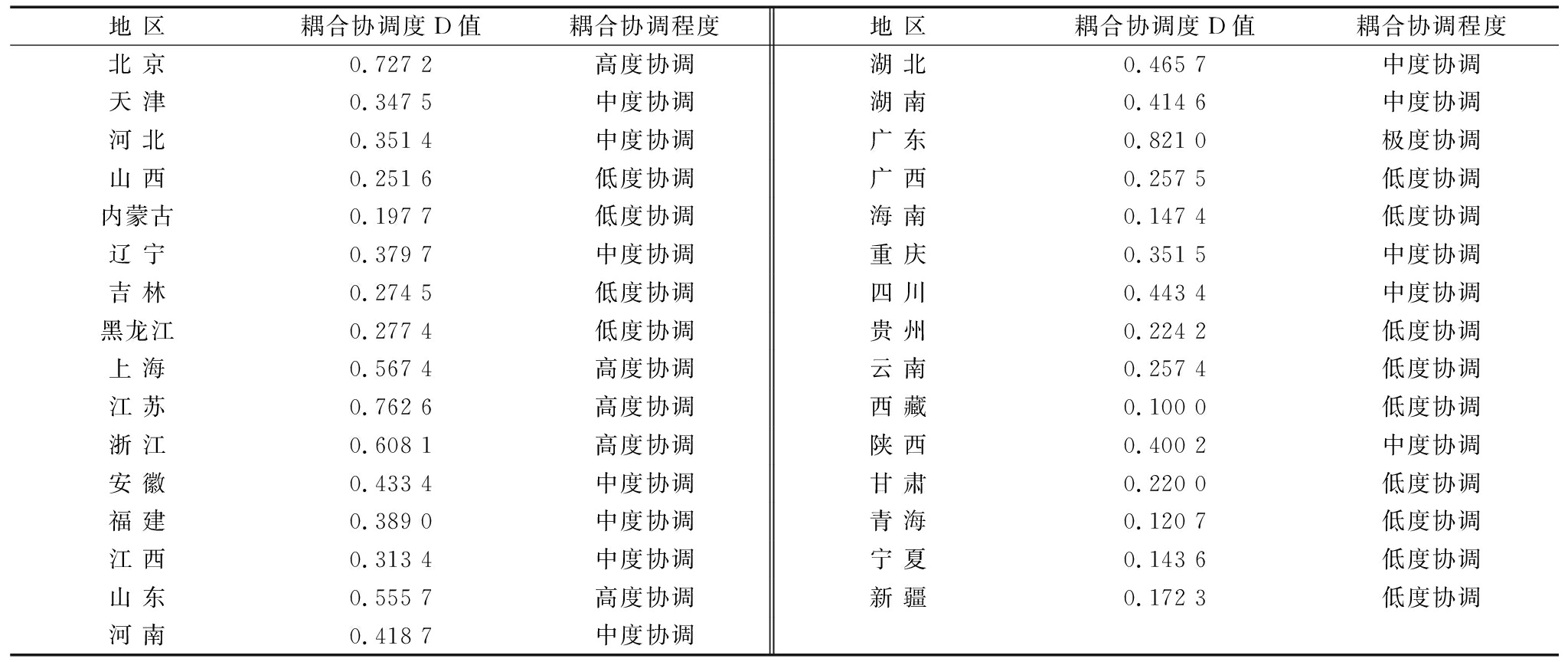 Di表示第i个省份的创新链耦合协调度。D值区间为[0,1],当D=0时表示区域创新链各阶段之间处于无序耦合状态,反之,区域创新链各阶段之间的相互作用和关联性较强。