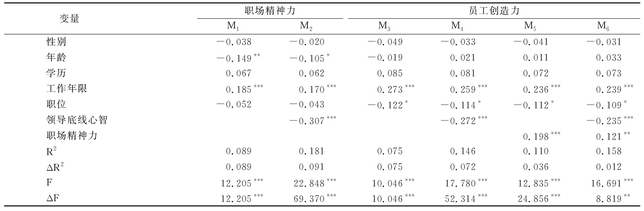 变量 职场精神力M1M2员工创造力M3M4M5M6性别-0.038-0.020-0.049-0.033-0.041-0.031年龄-0.149**-0.105*-0.0190.0210.0110.033学历0.0670.0620.0850.0810.0720.073工作年限0.185***0.170***0.273***0.259***0.236***0.239***职位-0.052-0.043-0.122*-0.114*-0.112*-0.109*领导底线心智-0.307***-0.272***-0.235***职场精神力0.198***0.121**R20.0890.1810.0750.1460.1100.158ΔR20.0890.0910.0750.0720.0360.012F12.205***22.848***10.046***17.780***12.835***16.691***ΔF12.205***69.370***10.046***52.314***24.856***8.819**