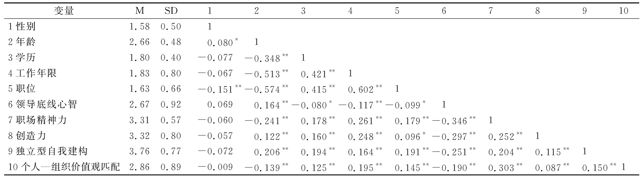 变量MSD 1 2 3 4 5 6 7 8 910 1性别1.580.50 1 2年龄2.660.480.080* 1 3学历1.800.40-0.077-0.348** 1 4工作年限1.830.80-0.067-0.513**0.421** 1 5职位1.630.66-0.151**-0.574**0.415**0.602** 1 6领导底线心智2.670.920.0690.164**-0.080*-0.117**-0.099* 1 7职场精神力3.310.57-0.060-0.241**0.178**0.261**0.179**-0.346** 1 8创造力3.320.80-0.0570.122**0.160**0.248**0.096*-0.297**0.252** 1 9独立型自我建构3.760.77-0.0720.206**0.194**0.164**0.191**-0.251**0.204**0.115** 110个人—组织价值观匹配2.860.89-0.009-0.139**0.125**0.195**0.145**-0.190**0.303**0.087**0.150**1