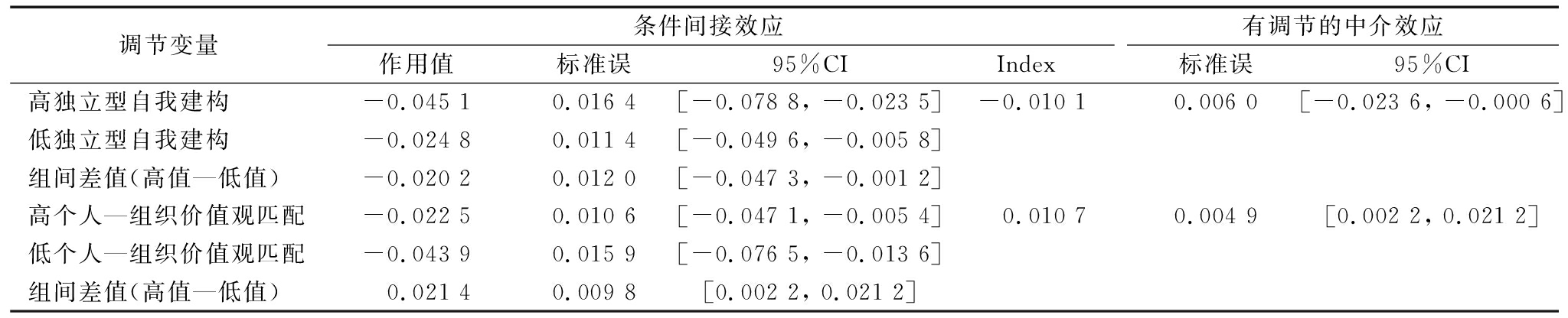 调节变量条件间接效应作用值 标准误 95%CI Index有调节的中介效应标准误 95%CI高独立型自我建构-0.045 10.016 4[-0.078 8, -0.023 5]-0.010 10.006 0[-0.023 6, -0.000 6]低独立型自我建构-0.024 80.011 4[-0.049 6, -0.005 8] 组间差值(高值—低值)-0.020 20.012 0[-0.047 3, -0.001 2] 高个人—组织价值观匹配-0.022 50.010 6[-0.047 1, -0.005 4]0.010 70.004 9[0.002 2, 0.021 2]低个人—组织价值观匹配-0.043 90.015 9[-0.076 5, -0.013 6] 组间差值(高值—低值)0.021 40.009 8[0.002 2, 0.021 2]
