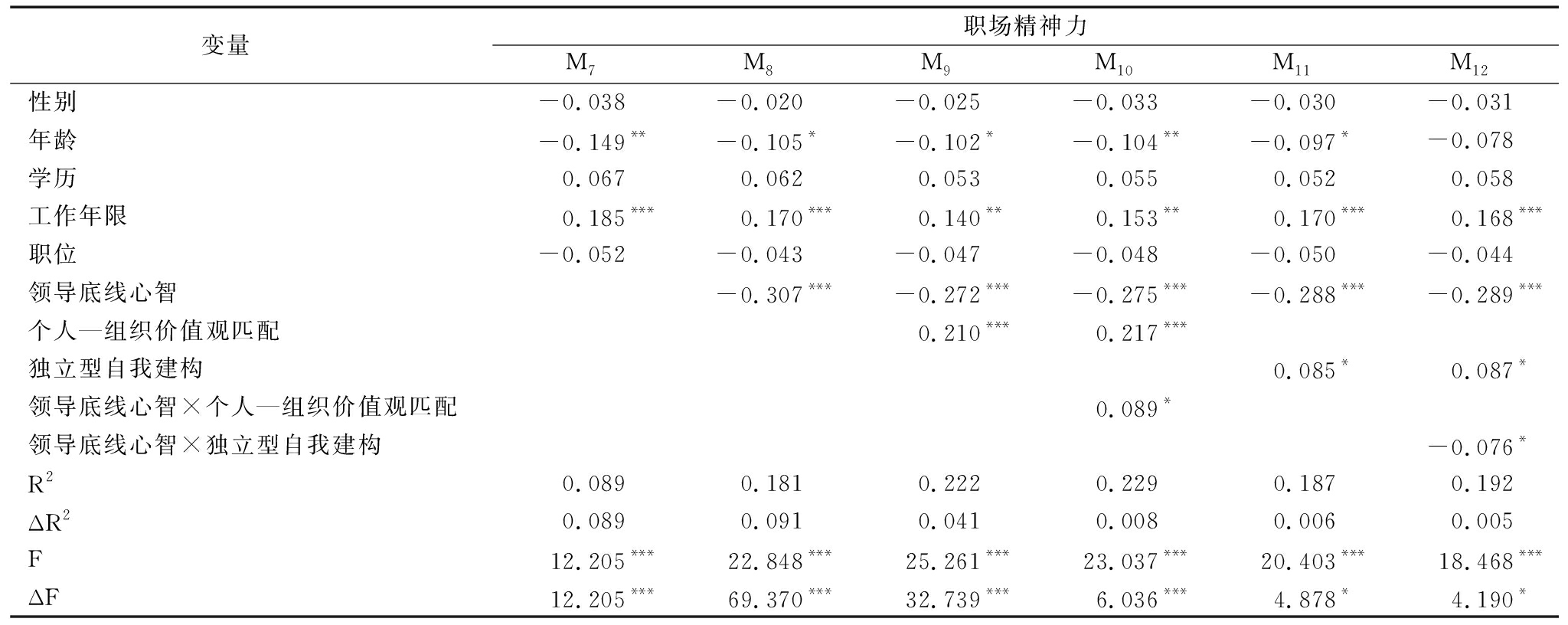 变量 职场精神力M7M8 M9 M10 M11 M12 性别-0.038-0.020 -0.025 -0.033 -0.030 -0.031 年龄-0.149**-0.105* -0.102* -0.104** -0.097* -0.078 学历0.0670.062 0.053 0.055 0.052 0.058 工作年限0.185***0.170*** 0.140** 0.153** 0.170*** 0.168*** 职位-0.052-0.043 -0.047 -0.048 -0.050 -0.044领导底线心智 -0.307*** -0.272*** -0.275*** -0.288*** -0.289***个人—组织价值观匹配 0.210*** 0.217*** 独立型自我建构 0.085* 0.087*领导底线心智×个人—组织价值观匹配 0.089* 领导底线心智×独立型自我建构 -0.076* R20.089 0.181 0.222 0.229 0.187 0.192 ΔR20.089 0.091 0.041 0.008 0.006 0.005 F12.205***22.848*** 25.261*** 23.037*** 20.403*** 18.468*** ΔF12.205***69.370*** 32.739*** 6.036*** 4.878* 4.190*