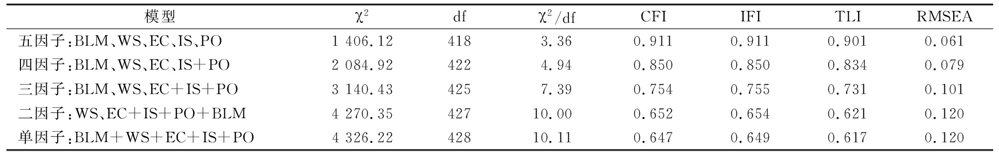模型 χ2 df χ2/df CFI IFI TLIRMSEA五因子:BLM、WS、EC、IS、PO1 406.12418 3.360.9110.9110.901 0.061四因子:BLM、WS、EC、IS+PO2 084.92422 4.940.8500.8500.834 0.079三因子:BLM、WS、EC+IS+PO3 140.43425 7.390.7540.7550.731 0.101二因子:WS、EC+IS+PO+BLM4 270.3542710.000.6520.6540.6210.120单因子:BLM+WS+EC+IS+PO4 326.2242810.110.6470.6490.6170.120