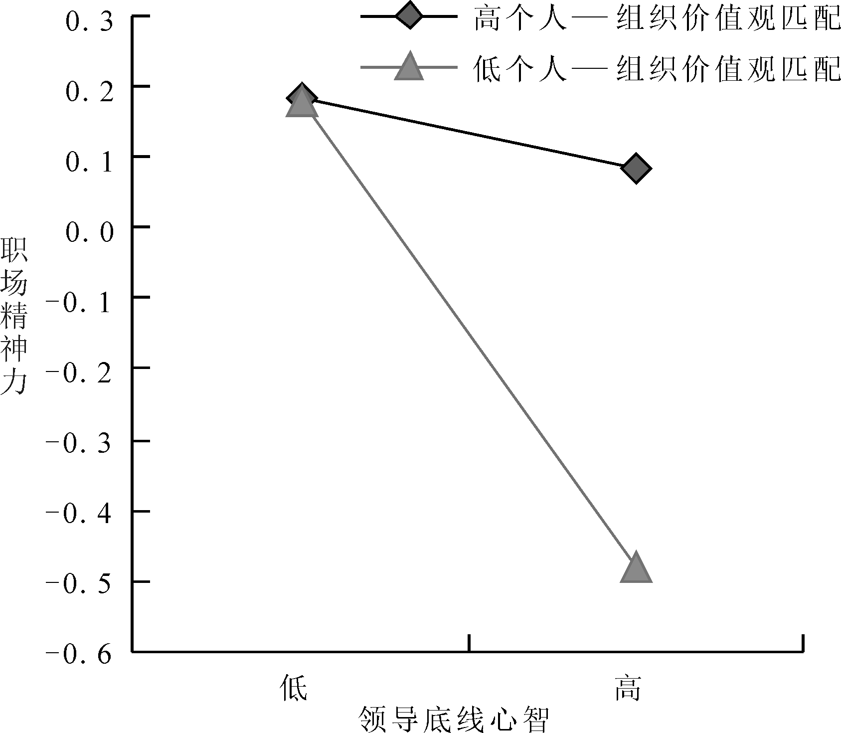 为了直观体现调节效应,分别在高于调节变量平均值1个标准差和低于平均值1个标准差的基准上绘制调节作用图,如图2、图3所示。图2显示,随着独立型自我建构评分由低到高,领导底线心智对员工职场精神力的负向影响得到增强;图3显示,随着个人—组织价值观匹配程度由低到高,领导底线心智对员工职场精神力的负向影响被减弱。
