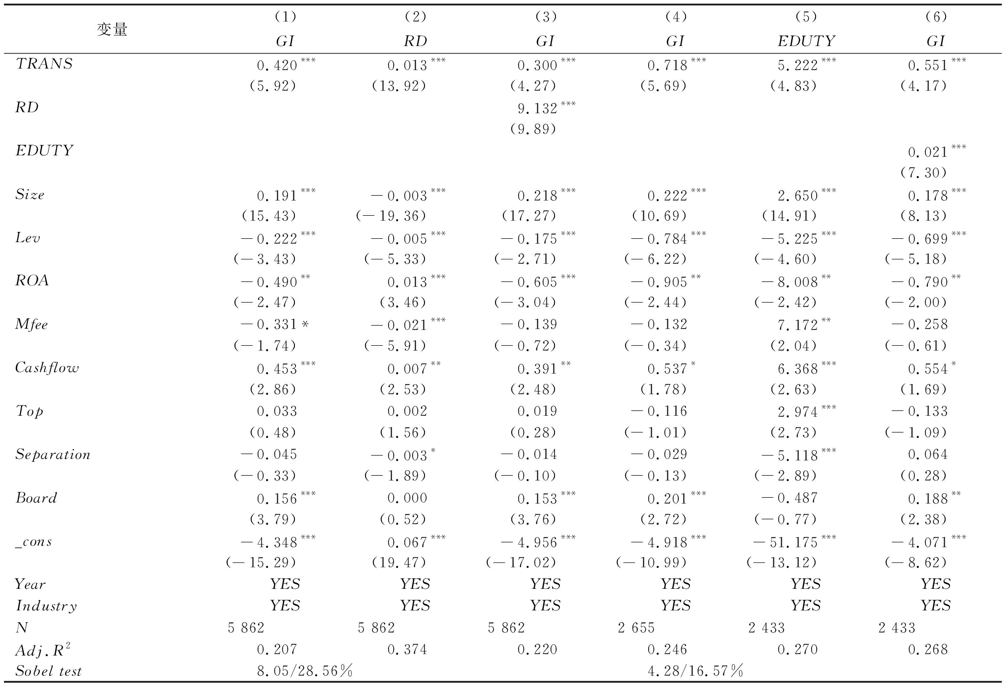 变量(1)(2)(3)(4)(5)(6)GIRDGIGIEDUTYGITRANS0.420***0.013***0.300***0.718***5.222***0.551***(5.92)(13.92)(4.27)(5.69)(4.83)(4.17)RD9.132***(9.89)EDUTY0.021***(7.30)Size0.191***-0.003***0.218***0.222***2.650***0.178***(15.43)(-19.36)(17.27)(10.69)(14.91)(8.13)Lev-0.222***-0.005***-0.175***-0.784***-5.225***-0.699***(-3.43)(-5.33)(-2.71)(-6.22)(-4.60)(-5.18)ROA-0.490**0.013***-0.605***-0.905**-8.008**-0.790**(-2.47)(3.46)(-3.04)(-2.44)(-2.42)(-2.00)Mfee-0.331*-0.021***-0.139-0.1327.172**-0.258(-1.74)(-5.91)(-0.72)(-0.34)(2.04)(-0.61)Cashflow0.453***0.007**0.391**0.537*6.368***0.554*(2.86)(2.53)(2.48)(1.78)(2.63)(1.69)Top0.0330.0020.019-0.1162.974***-0.133(0.48)(1.56)(0.28)(-1.01)(2.73)(-1.09)Separation-0.045-0.003*-0.014-0.029-5.118***0.064(-0.33)(-1.89)(-0.10)(-0.13)(-2.89)(0.28)Board0.156***0.0000.153***0.201***-0.4870.188**(3.79)(0.52)(3.76)(2.72)(-0.77)(2.38)_cons-4.348***0.067***-4.956***-4.918***-51.175***-4.071***(-15.29)(19.47)(-17.02)(-10.99)(-13.12)(-8.62)YearYESYESYESYESYESYESIndustryYESYESYESYESYESYESN5 8625 8625 8622 6552 4332 433Adj.R20.2070.3740.2200.2460.2700.268Sobel test8.05/28.56%4.28/16.57%