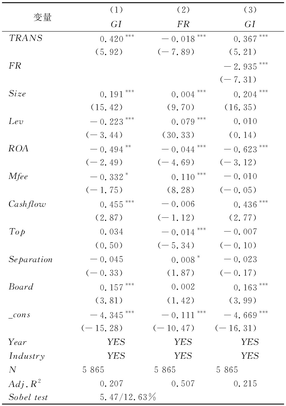 变量(1)(2)(3)GIFRGITRANS0.420***-0.018***0.367***(5.92)(-7.89)(5.21)FR-2.935***(-7.31)Size0.191***0.004***0.204***(15.42)(9.70)(16.35)Lev-0.223***0.079***0.010(-3.44)(30.33)(0.14)ROA-0.494**-0.044***-0.623***(-2.49)(-4.69)(-3.12)Mfee-0.332*0.110***-0.010(-1.75)(8.28)(-0.05)Cashflow0.455***-0.0060.436***(2.87)(-1.12)(2.77)Top0.034-0.014***-0.007(0.50)(-5.34)(-0.10)Separation-0.0450.008*-0.023(-0.33)(1.87)(-0.17)Board0.157***0.0020.163***(3.81)(1.42)(3.99)_cons-4.345***-0.111***-4.669***(-15.28)(-10.47)(-16.31)YearYESYESYESIndustryYESYESYESN5 8655 8655 865Adj.R20.2070.5070.215Sobel test5.47/12.63%
