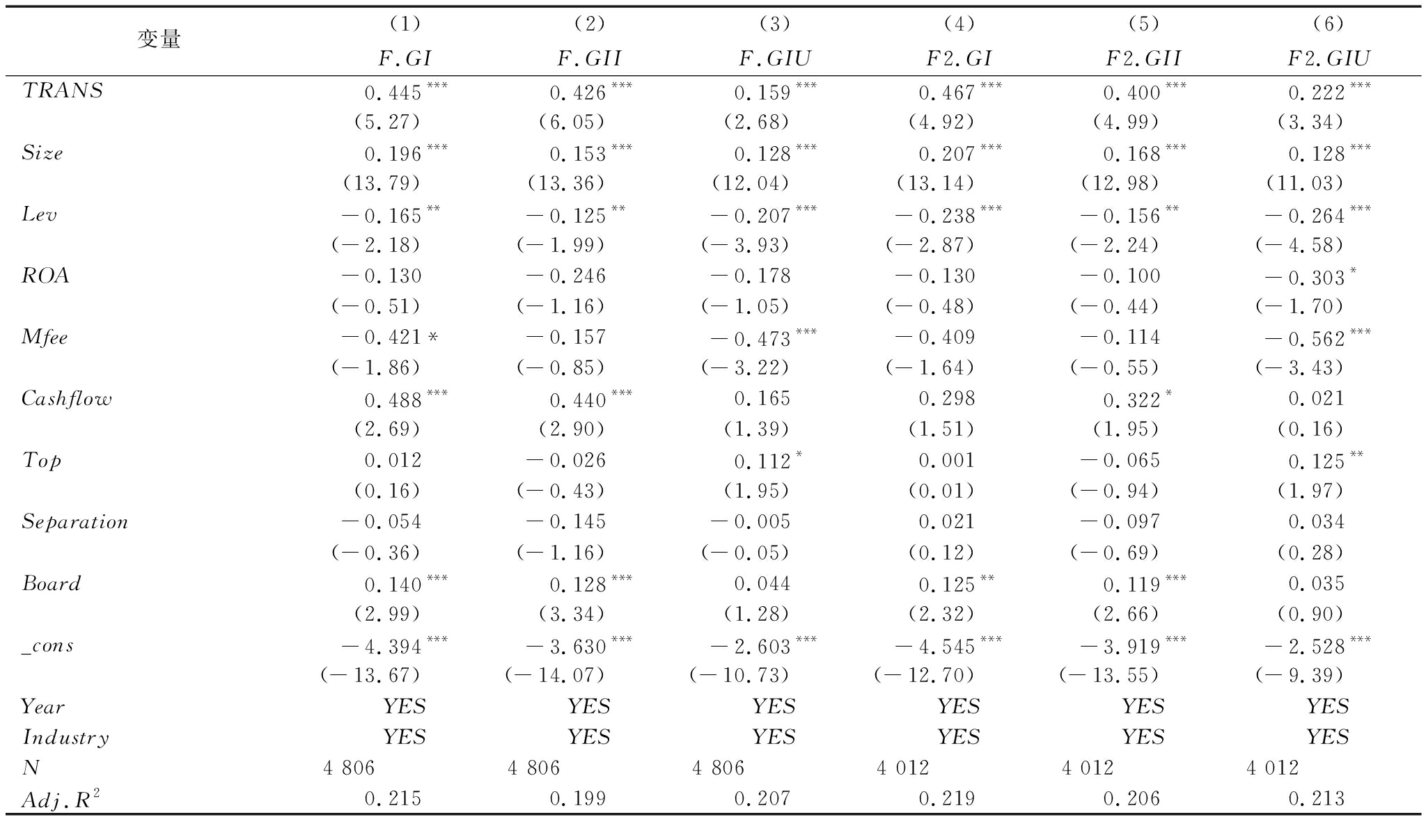 变量(1)(2)(3)(4)(5)(6)F.GIF.GIIF.GIUF2.GIF2.GIIF2.GIUTRANS0.445***0.426***0.159***0.467***0.400***0.222***(5.27)(6.05)(2.68)(4.92)(4.99)(3.34)Size0.196***0.153***0.128***0.207***0.168***0.128***(13.79)(13.36)(12.04)(13.14)(12.98)(11.03)Lev-0.165**-0.125**-0.207***-0.238***-0.156**-0.264***(-2.18)(-1.99)(-3.93)(-2.87)(-2.24)(-4.58)ROA-0.130-0.246-0.178-0.130-0.100-0.303*(-0.51)(-1.16)(-1.05)(-0.48)(-0.44)(-1.70)Mfee-0.421*-0.157-0.473***-0.409-0.114-0.562***(-1.86)(-0.85)(-3.22)(-1.64)(-0.55)(-3.43)Cashflow0.488***0.440***0.1650.2980.322*0.021(2.69)(2.90)(1.39)(1.51)(1.95)(0.16)Top0.012-0.0260.112*0.001-0.0650.125**(0.16)(-0.43)(1.95)(0.01)(-0.94)(1.97)Separation-0.054-0.145-0.0050.021-0.0970.034(-0.36)(-1.16)(-0.05)(0.12)(-0.69)(0.28)Board0.140***0.128***0.0440.125**0.119***0.035(2.99)(3.34)(1.28)(2.32)(2.66)(0.90)_cons-4.394***-3.630***-2.603***-4.545***-3.919***-2.528***(-13.67)(-14.07)(-10.73)(-12.70)(-13.55)(-9.39)YearYESYESYESYESYESYESIndustryYESYESYESYESYESYESN4 8064 8064 8064 0124 0124 012Adj.R20.2150.1990.2070.2190.2060.213