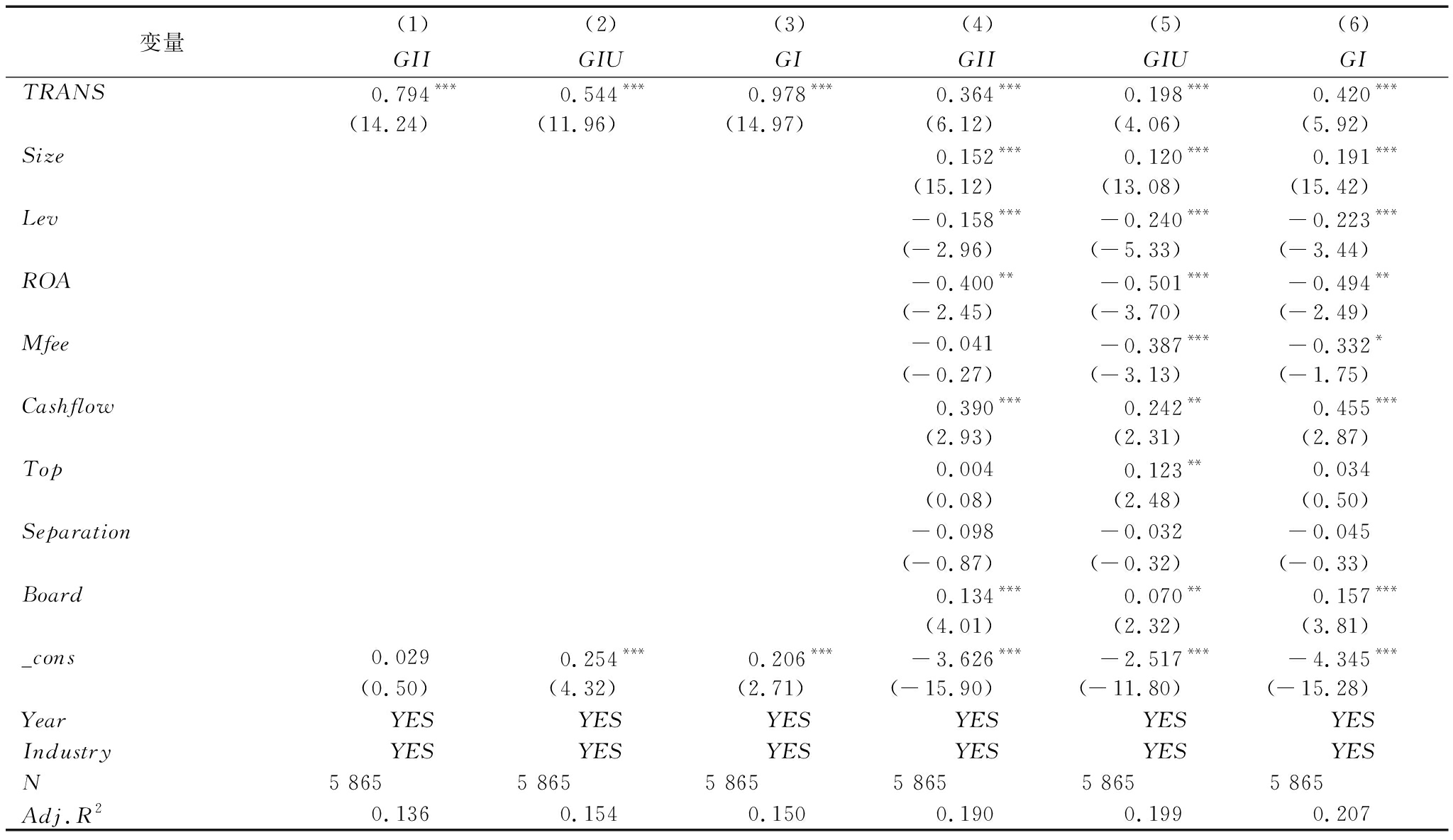 变量(1)(2)(3)(4)(5)(6)GIIGIUGIGIIGIUGITRANS0.794***0.544***0.978***0.364***0.198***0.420***(14.24)(11.96)(14.97)(6.12)(4.06)(5.92)Size0.152***0.120***0.191***(15.12)(13.08)(15.42)Lev-0.158***-0.240***-0.223***(-2.96)(-5.33)(-3.44)ROA-0.400**-0.501***-0.494**(-2.45)(-3.70)(-2.49)Mfee-0.041-0.387***-0.332*(-0.27)(-3.13)(-1.75)Cashflow0.390***0.242**0.455***(2.93)(2.31)(2.87)Top0.0040.123**0.034(0.08)(2.48)(0.50)Separation-0.098-0.032-0.045(-0.87)(-0.32)(-0.33)Board0.134***0.070**0.157***(4.01)(2.32)(3.81)_cons0.0290.254***0.206***-3.626***-2.517***-4.345***(0.50)(4.32)(2.71)(-15.90)(-11.80)(-15.28)YearYESYESYESYESYESYESIndustryYESYESYESYESYESYESN5 8655 8655 8655 8655 8655 865Adj.R20.1360.1540.1500.1900.1990.207