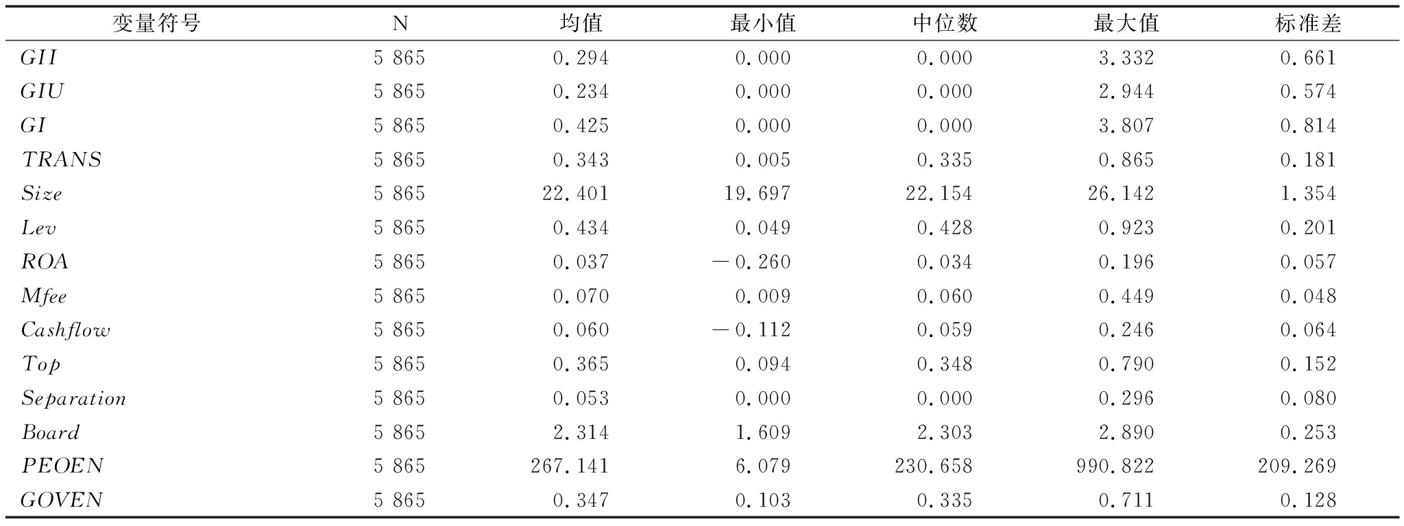 变量符号N均值最小值中位数最大值标准差GII5 8650.2940.0000.0003.3320.661GIU5 8650.2340.0000.0002.9440.574GI5 8650.4250.0000.0003.8070.814TRANS5 8650.3430.0050.3350.8650.181Size5 86522.40119.69722.15426.1421.354Lev5 8650.4340.0490.4280.9230.201ROA5 8650.037-0.2600.0340.1960.057Mfee5 8650.0700.0090.0600.4490.048Cashflow5 8650.060-0.1120.0590.2460.064Top5 8650.3650.0940.3480.7900.152Separation5 8650.0530.0000.0000.2960.080Board5 8652.3141.6092.3032.8900.253PEOEN5 865267.1416.079230.658990.822209.269GOVEN5 8650.3470.1030.3350.7110.128