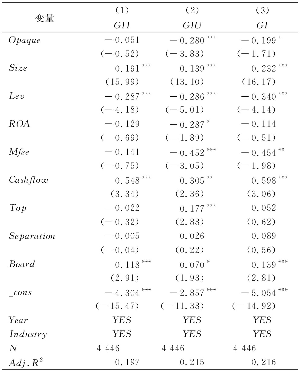 变量(1)(2)(3)GIIGIUGIOpaque-0.051-0.280***-0.199*(-0.52)(-3.83)(-1.71)Size0.191***0.139***0.232***(15.99)(13.10)(16.17)Lev-0.287***-0.286***-0.340***(-4.18)(-5.01)(-4.14)ROA-0.129-0.287*-0.114(-0.69)(-1.89)(-0.51)Mfee-0.141-0.452***-0.454**(-0.75)(-3.05)(-1.98)Cashflow0.548***0.305**0.598***(3.34)(2.36)(3.06)Top-0.0220.177***0.052(-0.32)(2.88)(0.62)Separation-0.0050.0260.089(-0.04)(0.22)(0.56)Board0.118***0.070*0.139***(2.91)(1.93)(2.81)_cons-4.304***-2.857***-5.054***(-15.47)(-11.38)(-14.92)YearYESYESYESIndustryYESYESYESN4 4464 4464 446Adj.R20.1970.2150.216