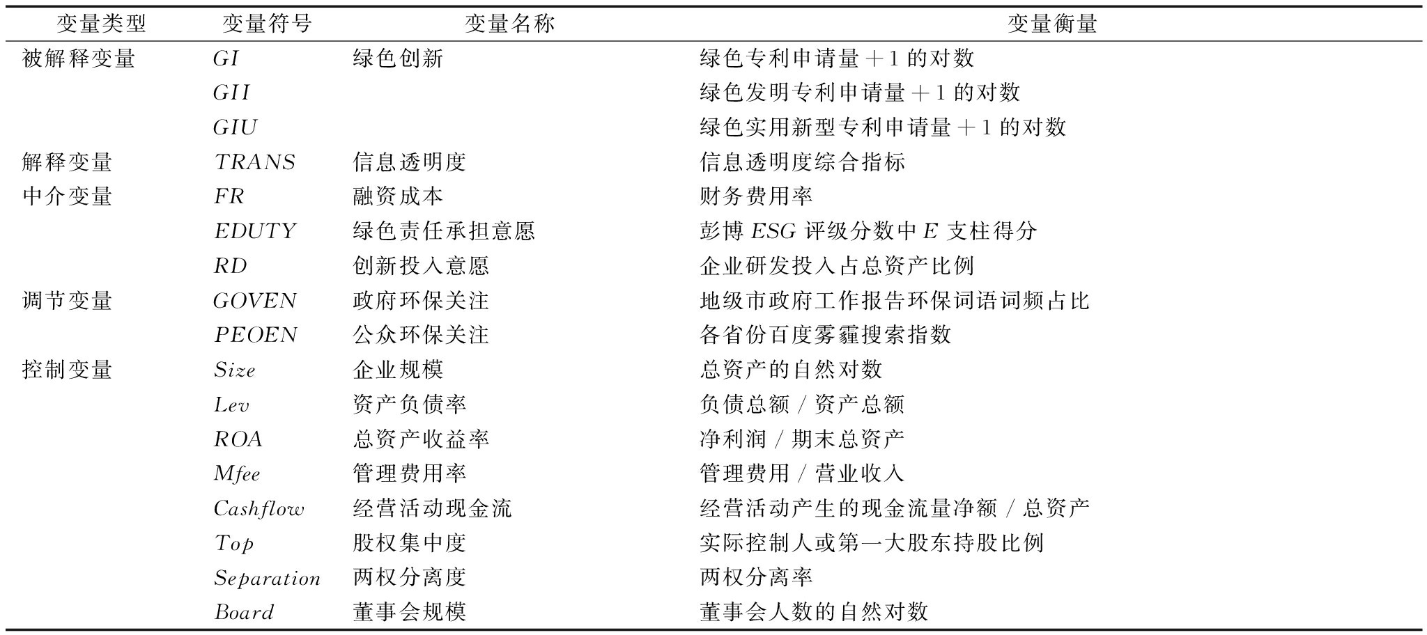 变量类型变量符号变量名称变量衡量被解释变量GI绿色创新绿色专利申请量+1的对数GII绿色发明专利申请量+1的对数GIU绿色实用新型专利申请量+1的对数解释变量TRANS 信息透明度信息透明度综合指标中介变量FR融资成本财务费用率EDUTY绿色责任承担意愿彭博ESG评级分数中E支柱得分RD创新投入意愿企业研发投入占总资产比例调节变量GOVEN政府环保关注地级市政府工作报告环保词语词频占比PEOEN公众环保关注各省份百度雾霾搜索指数控制变量Size企业规模总资产的自然对数Lev资产负债率负债总额/资产总额ROA总资产收益率净利润/期末总资产Mfee管理费用率管理费用/营业收入Cashflow经营活动现金流经营活动产生的现金流量净额/总资产Top股权集中度实际控制人或第一大股东持股比例Separation两权分离度两权分离率Board董事会规模董事会人数的自然对数