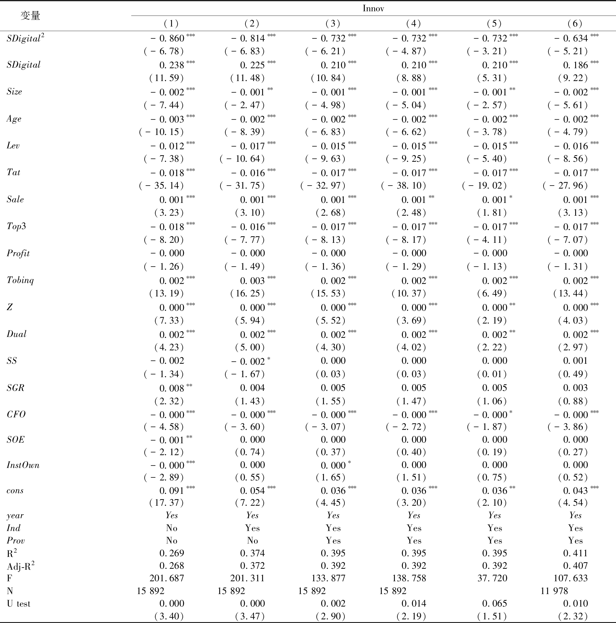 变量Innov(1)(2)(3)(4)(5)(6)SDigital2-0.860∗∗∗-0.814∗∗∗-0.732∗∗∗-0.732∗∗∗-0.732∗∗∗-0.634∗∗∗(-6.78)(-6.83)(-6.21)(-4.87)(-3.21)(-5.21)SDigital0.238∗∗∗0.225∗∗∗0.210∗∗∗0.210∗∗∗0.210∗∗∗0.186∗∗∗(11.59)(11.48)(10.84)(8.88)(5.31)(9.22)Size-0.002∗∗∗-0.001∗∗-0.001∗∗∗-0.001∗∗∗-0.001∗∗-0.002∗∗∗(-7.44)(-2.47)(-4.98)(-5.04)(-2.57)(-5.61)Age-0.003∗∗∗-0.002∗∗∗-0.002∗∗∗-0.002∗∗∗-0.002∗∗∗-0.002∗∗∗(-10.15)(-8.39)(-6.83)(-6.62)(-3.78)(-4.79)Lev-0.012∗∗∗-0.017∗∗∗-0.015∗∗∗-0.015∗∗∗-0.015∗∗∗-0.016∗∗∗(-7.38)(-10.64)(-9.63)(-9.25)(-5.40)(-8.56)Tat-0.018∗∗∗-0.016∗∗∗-0.017∗∗∗-0.017∗∗∗-0.017∗∗∗-0.017∗∗∗(-35.14)(-31.75)(-32.97)(-38.10)(-19.02)(-27.96)Sale0.001∗∗∗0.001∗∗∗0.001∗∗∗0.001∗∗0.001∗0.001∗∗∗(3.23)(3.10)(2.68)(2.48)(1.81)(3.13)Top3-0.018∗∗∗-0.016∗∗∗-0.017∗∗∗-0.017∗∗∗-0.017∗∗∗-0.017∗∗∗(-8.20)(-7.77)(-8.13)(-8.17)(-4.11)(-7.07)Profit-0.000-0.000-0.000-0.000-0.000-0.000(-1.26)(-1.49)(-1.36)(-1.29)(-1.13)(-1.31)Tobinq0.002∗∗∗0.003∗∗∗0.002∗∗∗0.002∗∗∗0.002∗∗∗0.002∗∗∗(13.19)(16.25)(15.53)(10.37)(6.49)(13.44)Z0.000∗∗∗0.000∗∗∗0.000∗∗∗0.000∗∗∗0.000∗∗0.000∗∗∗(7.33)(5.94)(5.52)(3.69)(2.19)(4.03)Dual0.002∗∗∗0.002∗∗∗0.002∗∗∗0.002∗∗∗0.002∗∗0.002∗∗∗(4.23)(5.00)(4.30)(4.02)(2.22)(2.97)SS-0.002-0.002∗0.0000.0000.0000.001(-1.34)(-1.67)(0.03)(0.03)(0.01)(0.49)SGR0.008∗∗0.0040.0050.0050.0050.003(2.32)(1.43)(1.55)(1.47)(1.06)(0.88)CFO-0.000∗∗∗-0.000∗∗∗-0.000∗∗∗-0.000∗∗∗-0.000∗-0.000∗∗∗(-4.58)(-3.60)(-3.07)(-2.72)(-1.87)(-3.86)SOE-0.001∗∗0.0000.0000.0000.0000.000(-2.12)(0.74)(0.37)(0.40)(0.19)(0.27)InstOwn-0.000∗∗∗0.0000.000∗0.0000.0000.000(-2.89)(0.55)(1.65)(1.51)(0.75)(0.52)cons0.091∗∗∗0.054∗∗∗0.036∗∗∗0.036∗∗∗0.036∗∗0.043∗∗∗(17.37)(7.22)(4.45)(3.20)(2.10)(4.54)yearYesYesYesYesYesYesIndNoYesYesYesYesYesProvNoNoYesYesYesYesR20.2690.3740.3950.3950.3950.411Adj-R20.2680.3720.3920.3920.3920.407F201.687201.311133.877138.75837.720107.633N15 89215 89215 89215 89211 978U test0.0000.0000.0020.0140.0650.010(3.40)(3.47)(2.90)(2.19)(1.51)(2.32)