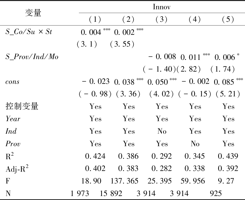 变量Innov(1)(2)(3)(4)(5)S_Co/Su×St0.004∗∗∗0.002∗∗∗(3.1)(3.55)S_Prov/Ind/Mo-0.0080.011∗∗∗0.006∗(-1.40)(2.82)(1.74)cons-0.0230.038∗∗∗0.050∗∗∗-0.0020.085∗∗∗(-0.98)(3.36)(4.02)(-0.15)(5.21)控制变量YesYesYesYesYesYearYesYesYesYesYesIndYesYesNoYesYesProvYesYesYesNoYesR20.4240.3860.2920.3450.439Adj-R20.4020.3830.2820.3380.392F18.90137.36525.39559.9569.27N1 97315 8923 9143 914925