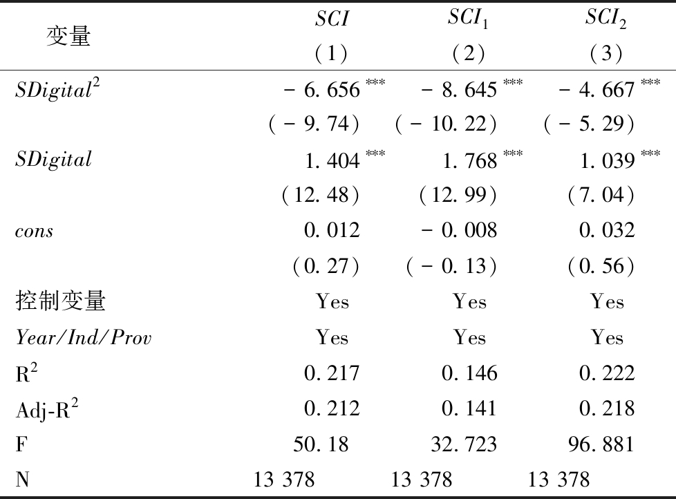 变量SCISCI1SCI2(1)(2)(3)SDigital2-6.656∗∗∗-8.645∗∗∗-4.667∗∗∗(-9.74)(-10.22)(-5.29)SDigital1.404∗∗∗1.768∗∗∗1.039∗∗∗(12.48)(12.99)(7.04)cons0.012-0.0080.032(0.27)(-0.13)(0.56)控制变量YesYesYesYear/Ind/ProvYesYesYesR20.2170.1460.222Adj-R20.2120.1410.218F50.1832.72396.881N13 37813 37813 378