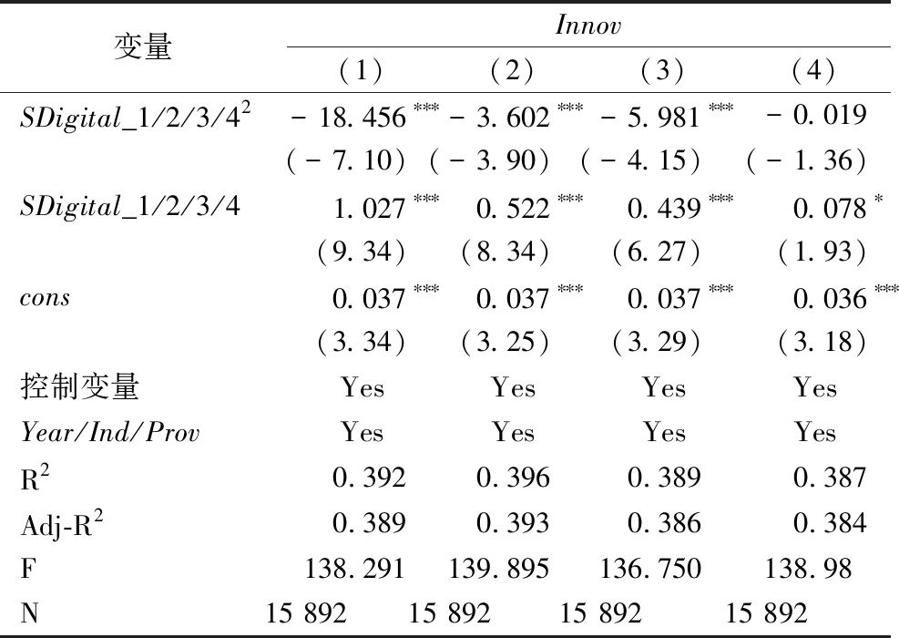 变量Innov(1)(2)(3)(4)SDigital_1/2/3/42-18.456∗∗∗-3.602∗∗∗-5.981∗∗∗-0.019(-7.10)(-3.90)(-4.15)(-1.36)SDigital_1/2/3/41.027∗∗∗0.522∗∗∗0.439∗∗∗0.078∗(9.34)(8.34)(6.27)(1.93)cons0.037∗∗∗0.037∗∗∗0.037∗∗∗0.036∗∗∗(3.34)(3.25)(3.29)(3.18)控制变量YesYesYesYesYear/Ind/ProvYesYesYesYesR20.3920.3960.3890.387Adj-R20.3890.3930.3860.384F138.291139.895136.750138.98N15 89215 89215 89215 892