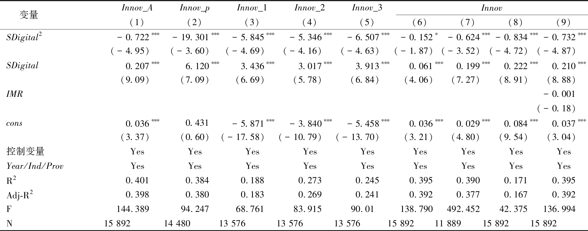 变量Innov_A(1)Innov_p(2)Innov_1(3)Innov_2(4)Innov_3(5)Innov(6)(7)(8)(9)SDigital2-0.722∗∗∗-19.301∗∗∗-5.845∗∗∗-5.346∗∗∗-6.507∗∗∗-0.152∗-0.624∗∗∗-0.834∗∗∗-0.732∗∗∗(-4.95)(-3.60)(-4.69)(-4.16)(-4.63)(-1.87)(-3.52)(-4.72)(-4.87)SDigital0.207∗∗∗6.120∗∗∗3.436∗∗∗3.017∗∗∗3.913∗∗∗0.061∗∗∗0.199∗∗∗0.222∗∗∗0.210∗∗∗(9.09)(7.09)(6.69)(5.78)(6.84)(4.06)(7.27)(8.91)(8.88)IMR-0.001(-0.18)cons0.036∗∗∗0.431-5.871∗∗∗-3.840∗∗∗-5.458∗∗∗0.036∗∗∗0.029∗∗∗0.084∗∗∗0.037∗∗∗(3.37)(0.60)(-17.58)(-10.79)(-13.70)(3.21)(4.80)(9.54)(3.04)控制变量YesYesYesYesYesYesYesYesYesYear/Ind/ProvYesYesYesYesYesYesYesYesYesR20.4010.3840.1880.2730.2450.3950.3900.1710.395Adj-R20.3980.3800.1830.2690.2410.3920.3770.1670.392F144.38994.24768.76183.91590.01138.790492.45242.375136.994N15 89214 48013 57613 57613 57615 89211 88915 89215 892
