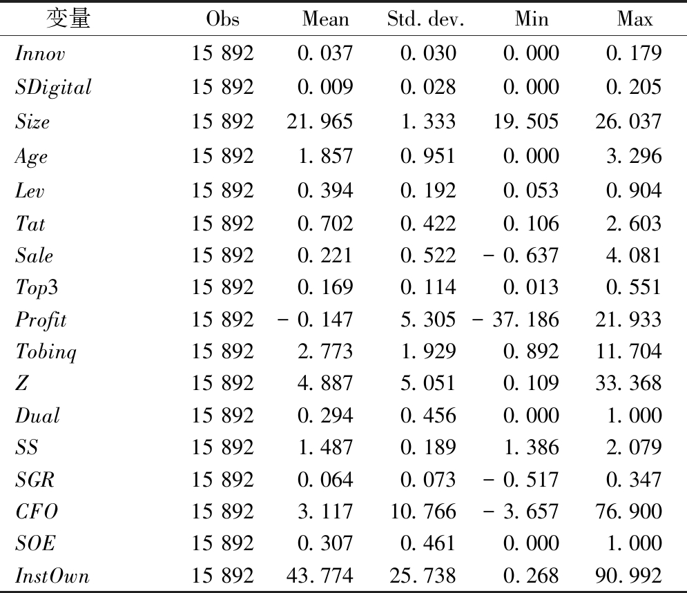 变量ObsMeanStd.dev.MinMaxInnov15 8920.037 0.030 0.000 0.179 SDigital15 8920.009 0.028 0.000 0.205 Size15 89221.965 1.333 19.505 26.037 Age15 8921.857 0.951 0.000 3.296 Lev15 8920.394 0.192 0.053 0.904 Tat15 8920.702 0.422 0.106 2.603 Sale15 8920.221 0.522 -0.637 4.081 Top315 8920.169 0.114 0.013 0.551 Profit15 892-0.147 5.305 -37.186 21.933 Tobinq15 8922.773 1.929 0.892 11.704 Z15 8924.887 5.051 0.109 33.368 Dual15 8920.294 0.456 0.000 1.000 SS15 8921.487 0.189 1.386 2.079 SGR15 8920.064 0.073 -0.517 0.347 CFO15 8923.117 10.766 -3.657 76.900 SOE15 8920.307 0.461 0.000 1.000 InstOwn15 89243.774 25.738 0.268 90.992