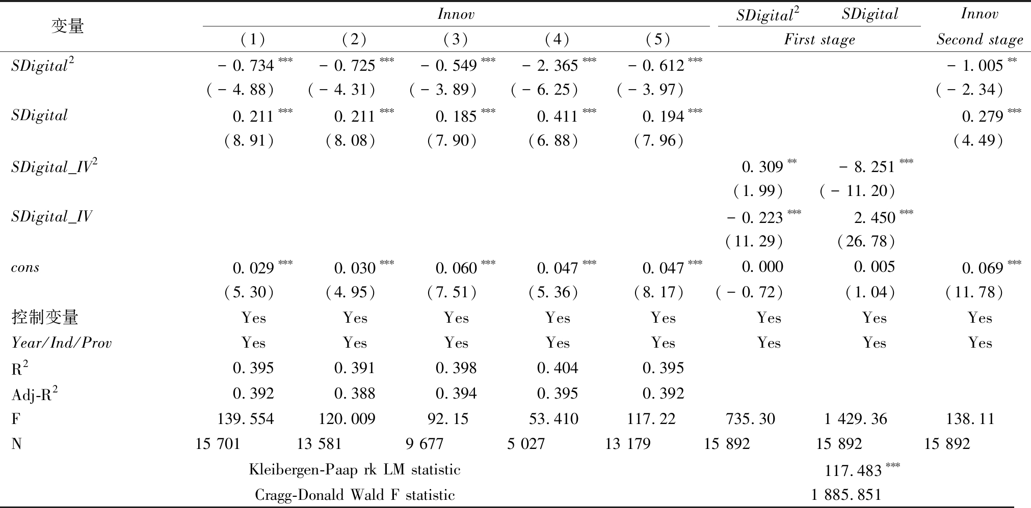 变量Innov(1)(2)(3)(4)(5)SDigital2SDigitalFirst stageInnovSecond stageSDigital2-0.734∗∗∗-0.725∗∗∗-0.549∗∗∗-2.365∗∗∗-0.612∗∗∗-1.005∗∗(-4.88)(-4.31)(-3.89)(-6.25)(-3.97)(-2.34)SDigital0.211∗∗∗0.211∗∗∗0.185∗∗∗0.411∗∗∗0.194∗∗∗0.279∗∗∗(8.91)(8.08)(7.90)(6.88)(7.96)(4.49)SDigital_IV20.309∗∗-8.251∗∗∗(1.99)(-11.20)SDigital_IV-0.223∗∗∗2.450∗∗∗(11.29)(26.78)cons0.029∗∗∗0.030∗∗∗0.060∗∗∗0.047∗∗∗0.047∗∗∗0.0000.0050.069∗∗∗(5.30)(4.95)(7.51)(5.36)(8.17)(-0.72)(1.04)(11.78)控制变量YesYesYesYesYesYesYesYesYear/Ind/ProvYesYesYesYesYesYesYesYesR20.3950.3910.3980.4040.395Adj-R20.3920.3880.3940.3950.392F139.554120.00992.1553.410117.22735.301 429.36138.11N15 70113 5819 6775 02713 17915 89215 89215 892Kleibergen-Paap rk LM statistic117.483∗∗∗Cragg-Donald Wald F statistic1 885.851