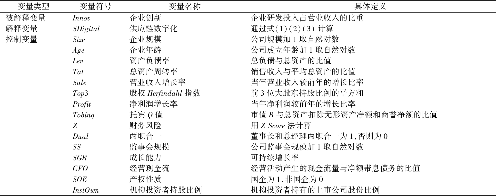 变量类型变量符号变量名称具体定义被解释变量Innov企业创新企业研发投入占营业收入的比重解释变量SDigital供应链数字化通过式(1)(2)(3)计算控制变量Size企业规模公司规模加1取自然对数Age企业年龄公司成立年龄加1取自然对数Lev资产负债率总负债与总资产的比值Tat总资产周转率销售收入与平均总资产的比值Sale营业收入增长率当年营业收入较前年的增长比率Top3股权Herfindahl指数前3位大股东持股比例的平方和Profit净利润增长率当年净利润较前年的增长比率Tobinq托宾Q值市值B与总资产扣除无形资产净额和商誉净额的比值Z财务风险用Z Score法计算Dual两职合一董事长和总经理两职合一为1,否则为0SS监事会规模公司监事会规模加1取自然对数SGR成长能力可持续增长率CFO经营现金流经营活动产生的现金流量与净额带息债务的比值SOE产权性质国企为1,非国企为0InstOwn机构投资者持股比例机构投资者持有的上市公司股份比例