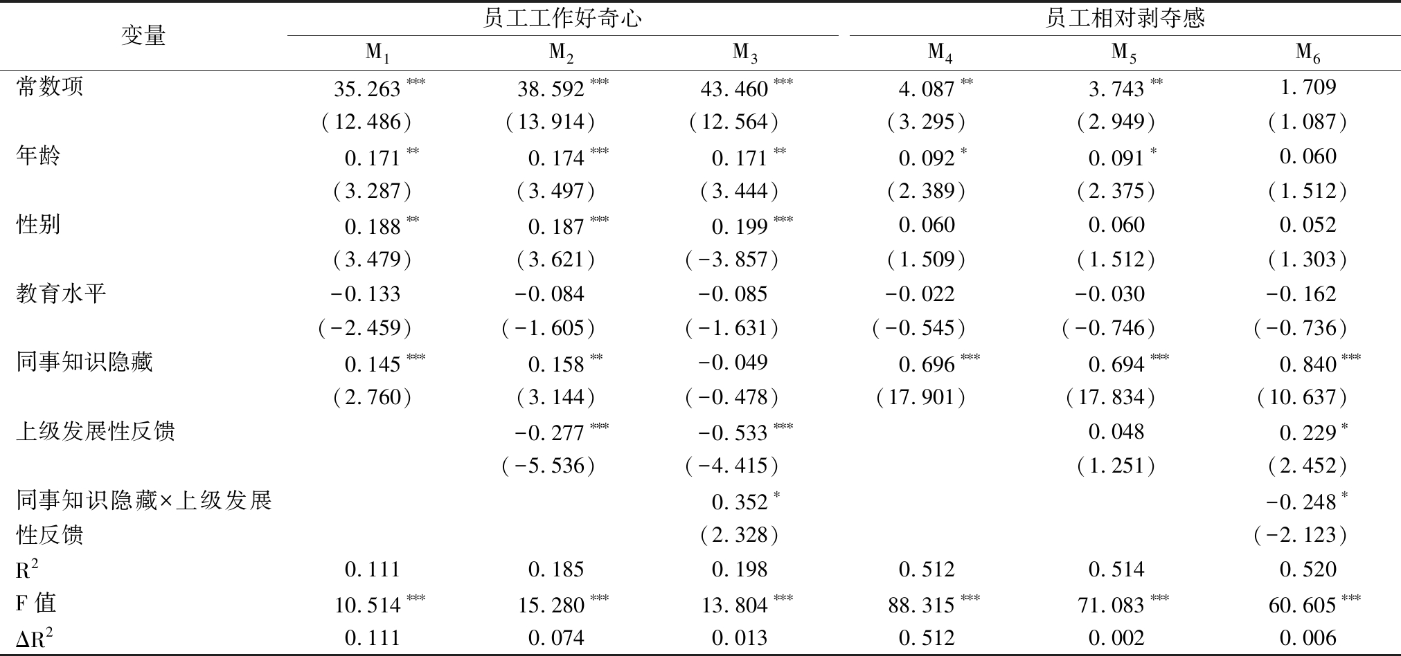 变量员工工作好奇心M1M2M3员工相对剥夺感M4M5M6常数项35.263∗∗∗38.592∗∗∗43.460∗∗∗4.087∗∗3.743∗∗1.709(12.486)(13.914)(12.564)(3.295)(2.949)(1.087)年龄0.171∗∗0.174∗∗∗0.171∗∗0.092∗0.091∗0.060(3.287)(3.497)(3.444)(2.389)(2.375)(1.512)性别0.188∗∗0.187∗∗∗0.199∗∗∗0.0600.0600.052(3.479)(3.621)(-3.857)(1.509)(1.512)(1.303)教育水平-0.133-0.084-0.085-0.022-0.030-0.162(-2.459)(-1.605)(-1.631)(-0.545)(-0.746)(-0.736)同事知识隐藏0.145∗∗∗0.158∗∗-0.0490.696∗∗∗0.694∗∗∗0.840∗∗∗(2.760)(3.144)(-0.478)(17.901)(17.834)(10.637)上级发展性反馈-0.277∗∗∗-0.533∗∗∗0.0480.229∗(-5.536)(-4.415)(1.251)(2.452)同事知识隐藏×上级发展性反馈0.352∗-0.248∗(2.328)(-2.123)R20.1110.1850.1980.5120.5140.520F值10.514∗∗∗15.280∗∗∗13.804∗∗∗88.315∗∗∗71.083∗∗∗60.605∗∗∗ΔR20.1110.0740.0130.5120.0020.006