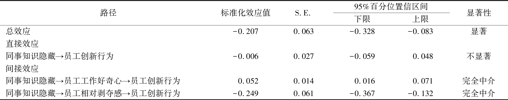 路径标准化效应值S.E.95%百分位置信区间下限上限显著性总效应-0.2070.063-0.328-0.083显著直接效应同事知识隐藏→员工创新行为-0.0060.027-0.0590.048不显著间接效应同事知识隐藏→员工工作好奇心→员工创新行为0.0520.0140.0160.071完全中介同事知识隐藏→员工相对剥夺感→员工创新行为-0.2490.061-0.367-0.132完全中介