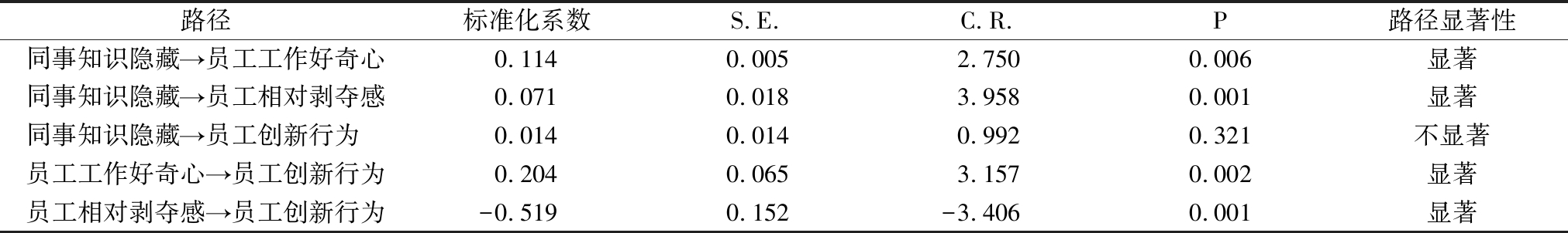 路径标准化系数S.E.C.R.P路径显著性同事知识隐藏→员工工作好奇心0.1140.0052.7500.006显著同事知识隐藏→员工相对剥夺感0.0710.0183.9580.001显著同事知识隐藏→员工创新行为 0.0140.0140.9920.321不显著员工工作好奇心→员工创新行为0.2040.0653.1570.002显著员工相对剥夺感→员工创新行为-0.5190.152-3.4060.001显著