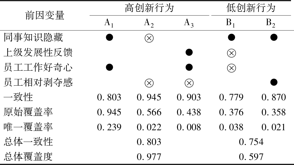 进一步,判断前因条件的互补或替代关系:一是根据“两个条件同时存在或缺席”的标准判断互补关系;二是根据“两个条件无法在构型中共存”的标准判断替代关系。首先,组态A1中同事知识隐藏与员工工作好奇心两个条件并发会引发员工高创新行为,但组态A2中同事知识隐藏与员工相对剥夺感两个条件同时缺席会引发员工高创新行为,表明同事知识隐藏与员工工作好奇心、相对剥夺感不存在相互替代或互补关系。其次,组态A1、A2、A3中员工工作好奇心条件存在、相对剥夺感条件不显著或缺席会引发高创新行为,组态B1和B2中员工工作好奇心条件缺席或员工相对剥夺感条件存在会引发低创新行为,表明在前因条件耦合对员工创新行为的影响中,员工工作好奇心与相对剥夺感存在相互替代关系。最后,组态A3中上级发展性反馈与员工工作好奇心两个条件并发会引发员工高创新行为,组态B1中上级发展性反馈与员工工作好奇心两个条件同时缺席会导致员工低创新行为,表明在前因条件耦合对员工创新行为的影响中,员工工作好奇心与上级发展性反馈存在互补关系。因此,假设H5b成立。
