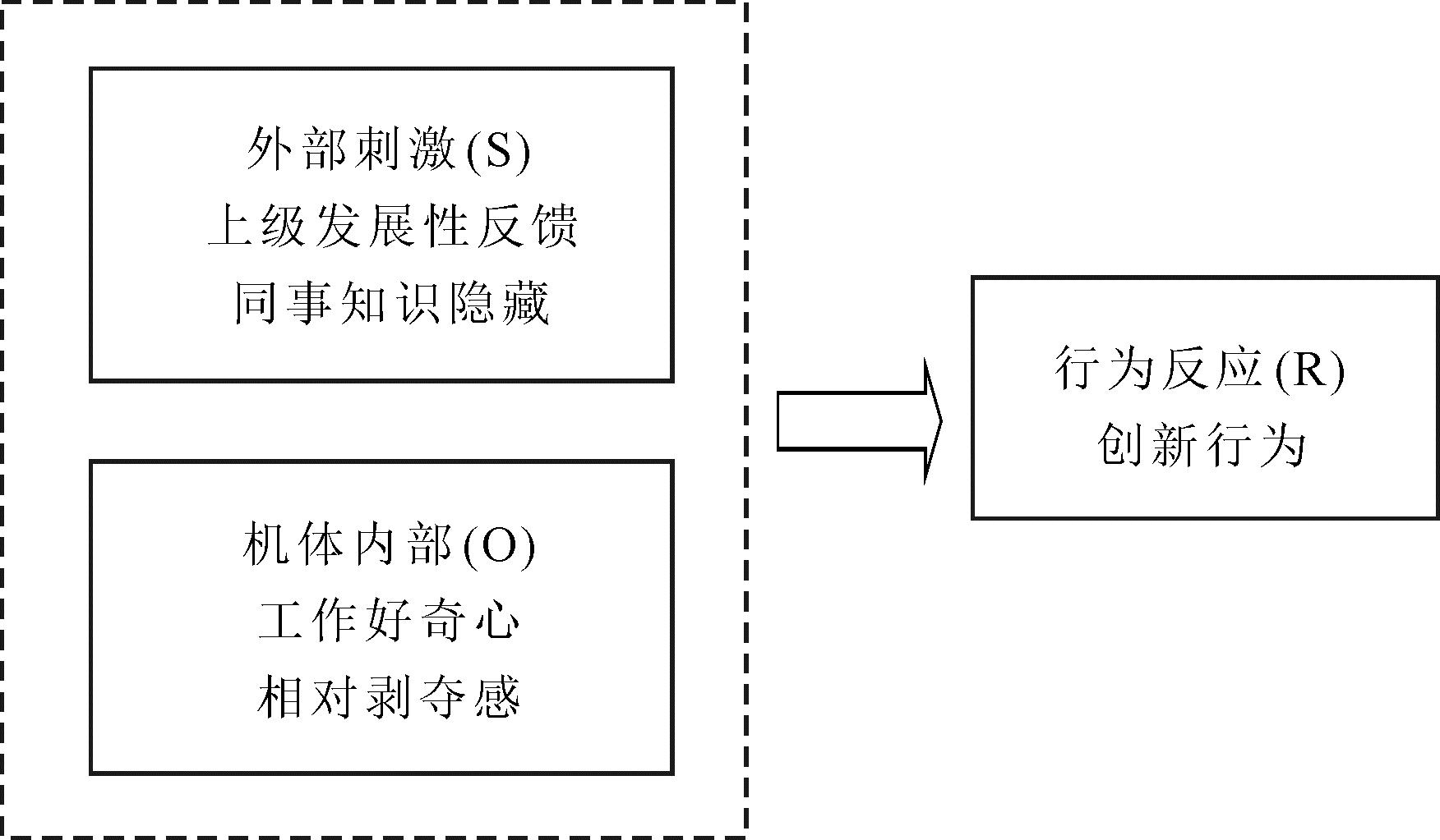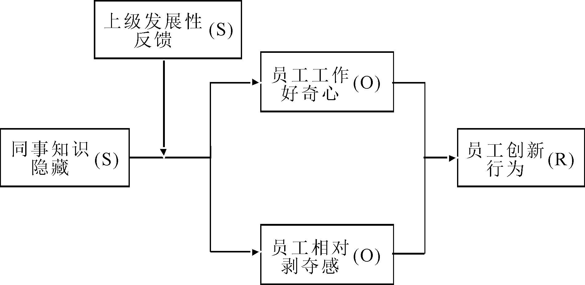 组态研究视角侧重于从非线性动力学角度理解和解释复杂现象与系统,强调复杂现象背后涉及的多种“殊途同归”路径,以及结果的前因条件相互交叉(intersect)或并发(conjunctures)(杜运周,2021)。SOR分析框架强调刺激与反应之间的非对称性,故本研究借鉴组态研究视角的复杂性原理予以解释。一方面,根据SOR分析框架可知,单一情景刺激条件不足以决定员工创新行为[19]。员工是否实施创新行为取决于面对同事知识隐藏情景时是工作好奇心还是相对剥夺感占据机体内部活动的主导地位,例如,“高同事知识隐藏条件下伴随的高工作好奇心”与“低同事知识隐藏条件下伴随的低相对剥夺感”在引发员工高创新行为上可能具有等效价值。另一方面,员工高工作好奇心会引发高创新行为,员工高相对剥夺感会导致低创新行为,因而工作好奇心与相对剥夺感可能在引发员工创新行为的前因组态中存在替代关系。同时,上级发展性反馈在同事知识隐藏对员工创新行为的影响中发挥增强或削弱员工内部机体反应的作用,因而上级发展性反馈与员工内部机体反应在共同引发员工创新行为的过程中可能相互补充。因此,本文提出如下假设: