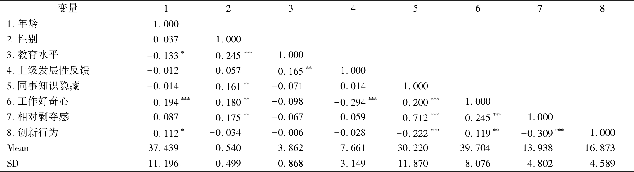 变量123456781.年龄1.0002.性别0.0371.0003.教育水平-0.133∗0.245∗∗∗1.0004.上级发展性反馈-0.0120.0570.165∗∗1.0005.同事知识隐藏-0.0140.161∗∗-0.0710.0141.0006.工作好奇心0.194∗∗∗0.180∗∗-0.098-0.294∗∗∗0.200∗∗∗1.0007.相对剥夺感0.0870.175∗∗-0.0670.0590.712∗∗∗0.245∗∗∗1.0008.创新行为0.112∗-0.034-0.006-0.028-0.222∗∗∗0.119∗∗-0.309∗∗∗1.000Mean37.4390.5403.8627.66130.22039.70413.93816.873SD11.1960.4990.8683.14911.8708.0764.8024.589