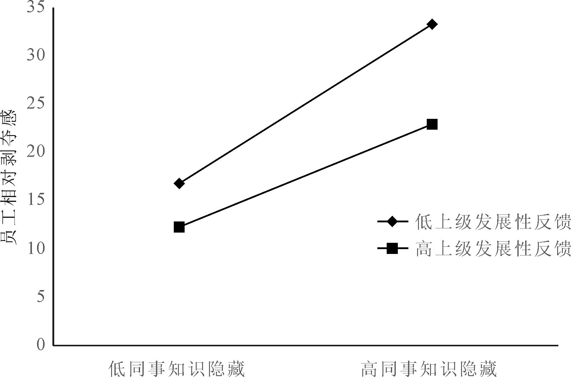 为更清晰地揭示上级发展性反馈在同事知识隐藏与员工工作好奇心、相对剥夺感之间的调节趋势,以上级发展性反馈的正负一个标准差为高低组,计算简单斜率并绘制调节效应图。如图3所示,在高水平上级发展性反馈条件下,同事知识隐藏与员工工作好奇心的回归直线的斜率值比低水平上级发展性反馈的斜率值大,同事知识隐藏对员工工作好奇心的促进作用更强,表明上级发展性反馈正向调节同事知识隐藏与员工工作好奇心之间的关系,因此,假设H3得到支持。如图4所示,在高水平上级发展性反馈条件下,同事知识隐藏与员工相对剥夺感的回归直线的斜率值比低水平上级发展性反馈的斜率值小,同事知识隐藏对员工相对剥夺感的促进作用更弱,表明上级发展性反馈负向调节同事知识隐藏与员工相对剥夺感之间的关系,因此,假设H4得到支持。