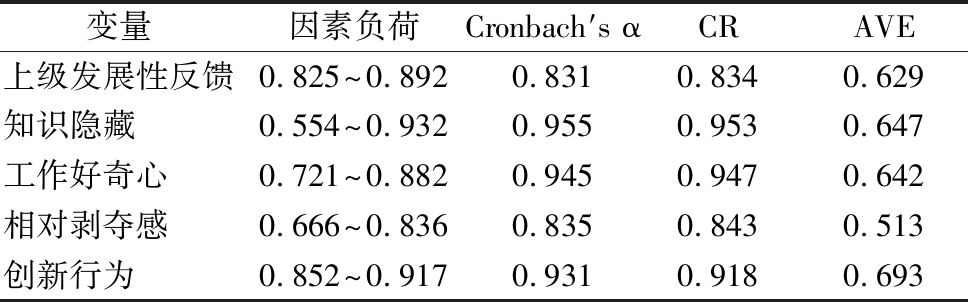 变量因素负荷Cronbach′s αCRAVE上级发展性反馈0.825^0.8920.8310.8340.629知识隐藏 0.554^0.9320.9550.9530.647工作好奇心 0.721^0.8820.9450.9470.642相对剥夺感 0.666^0.8360.8350.8430.513创新行为 0.852^0.9170.9310.9180.693