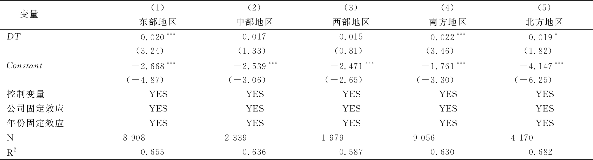 变量(1)(2)(3)(4)(5)东部地区中部地区西部地区南方地区北方地区DT0.020***0.0170.0150.022***0.019*(3.24)(1.33)(0.81)(3.46)(1.82)Constant-2.668***-2.539***-2.471***-1.761***-4.147***(-4.87)(-3.06)(-2.65)(-3.30)(-6.25)控制变量YESYESYESYESYES公司固定效应YESYESYESYESYES年份固定效应YESYESYESYESYESN8 9082 3391 9799 0564 170R20.6550.6360.5870.6300.682