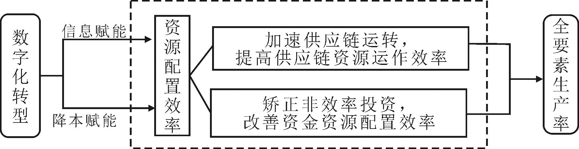 企业全要素生产率增长不仅来源于技术进步[26],而且受资源配置效率的影响[8-9,27]。对于我国制造企业而言,短期内技术进步的作用是有限的,改善资源配置效率才是真正可持续的生产率内生增长模式[4]。企业数字化转型可以有效发挥资源配置效应,不仅体现在加速供应链运转、提高供应链资源运作效率方面,而且体现在提高企业投资效率、优化资金资源配置方面。因此,数字化转型对企业全要素生产率的具体作用机制分析如下: