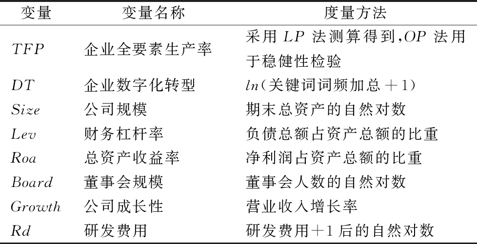 变量变量名称度量方法TFP企业全要素生产率采用LP法测算得到,OP法用于稳健性检验DT企业数字化转型ln(关键词词频加总+1)Size公司规模期末总资产的自然对数Lev财务杠杆率负债总额占资产总额的比重Roa总资产收益率净利润占资产总额的比重Board董事会规模董事会人数的自然对数Growth公司成长性营业收入增长率Rd研发费用研发费用+1后的自然对数
