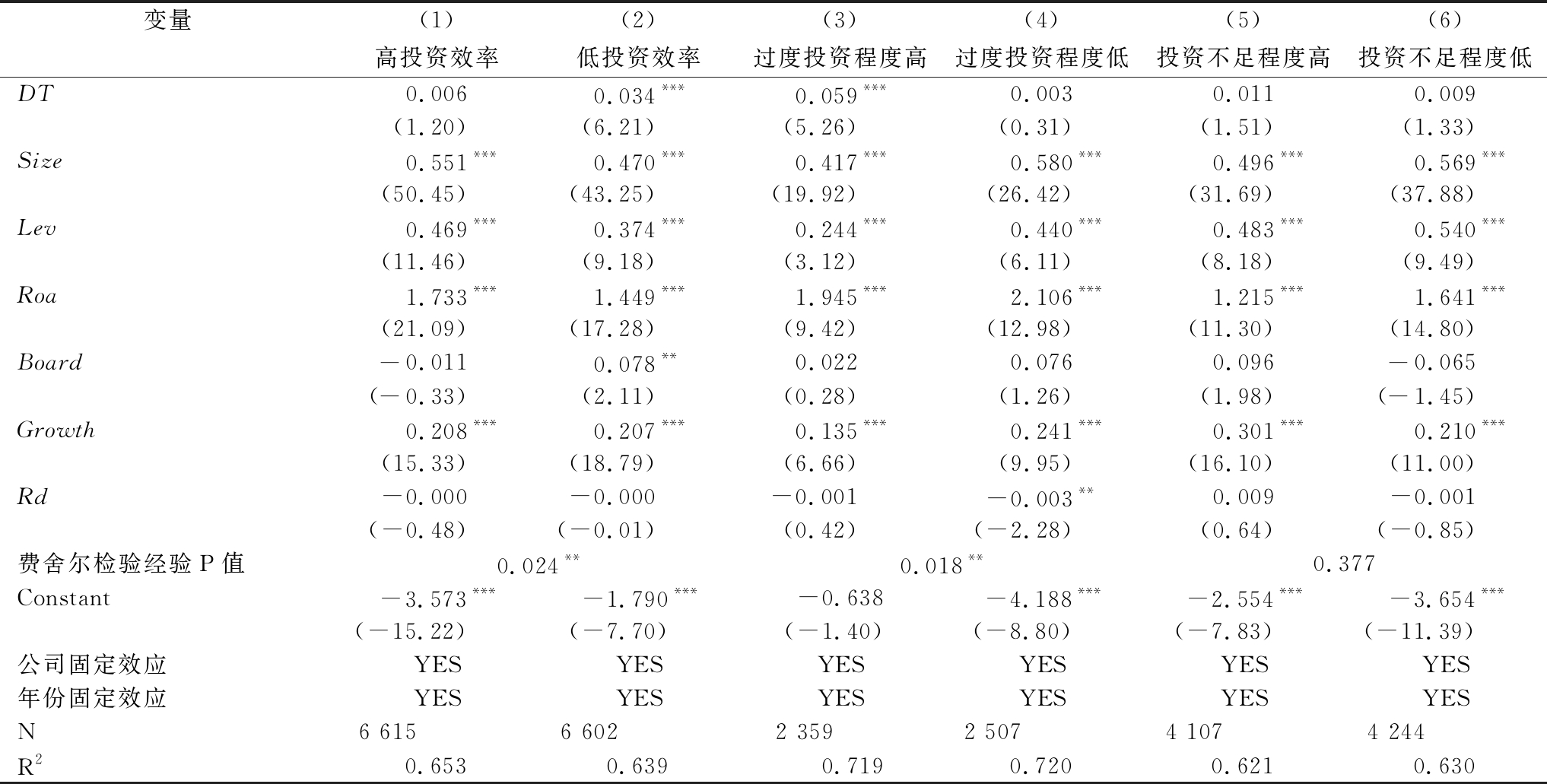 变量(1)(2)(3)(4)(5)(6)高投资效率低投资效率过度投资程度高过度投资程度低投资不足程度高投资不足程度低DT0.0060.034***0.059***0.0030.0110.009(1.20)(6.21)(5.26)(0.31)(1.51)(1.33)Size0.551***0.470***0.417***0.580***0.496***0.569***(50.45)(43.25)(19.92)(26.42)(31.69)(37.88)Lev0.469***0.374***0.244***0.440***0.483***0.540***(11.46)(9.18)(3.12)(6.11)(8.18)(9.49)Roa1.733***1.449***1.945***2.106***1.215***1.641***(21.09)(17.28)(9.42)(12.98)(11.30)(14.80)Board-0.0110.078**0.0220.0760.096-0.065(-0.33)(2.11)(0.28)(1.26)(1.98)(-1.45)Growth0.208***0.207***0.135***0.241***0.301***0.210***(15.33)(18.79)(6.66)(9.95)(16.10)(11.00)Rd-0.000-0.000-0.001-0.003**0.009-0.001(-0.48)(-0.01)(0.42)(-2.28)(0.64)(-0.85)费舍尔检验经验P值0.024**0.018**0.377Constant-3.573***-1.790***-0.638-4.188***-2.554***-3.654***(-15.22)(-7.70)(-1.40)(-8.80)(-7.83)(-11.39)公司固定效应YESYESYESYESYESYES年份固定效应YESYESYESYESYESYESN6 6156 6022 3592 5074 1074 244R20.6530.6390.7190.7200.6210.630