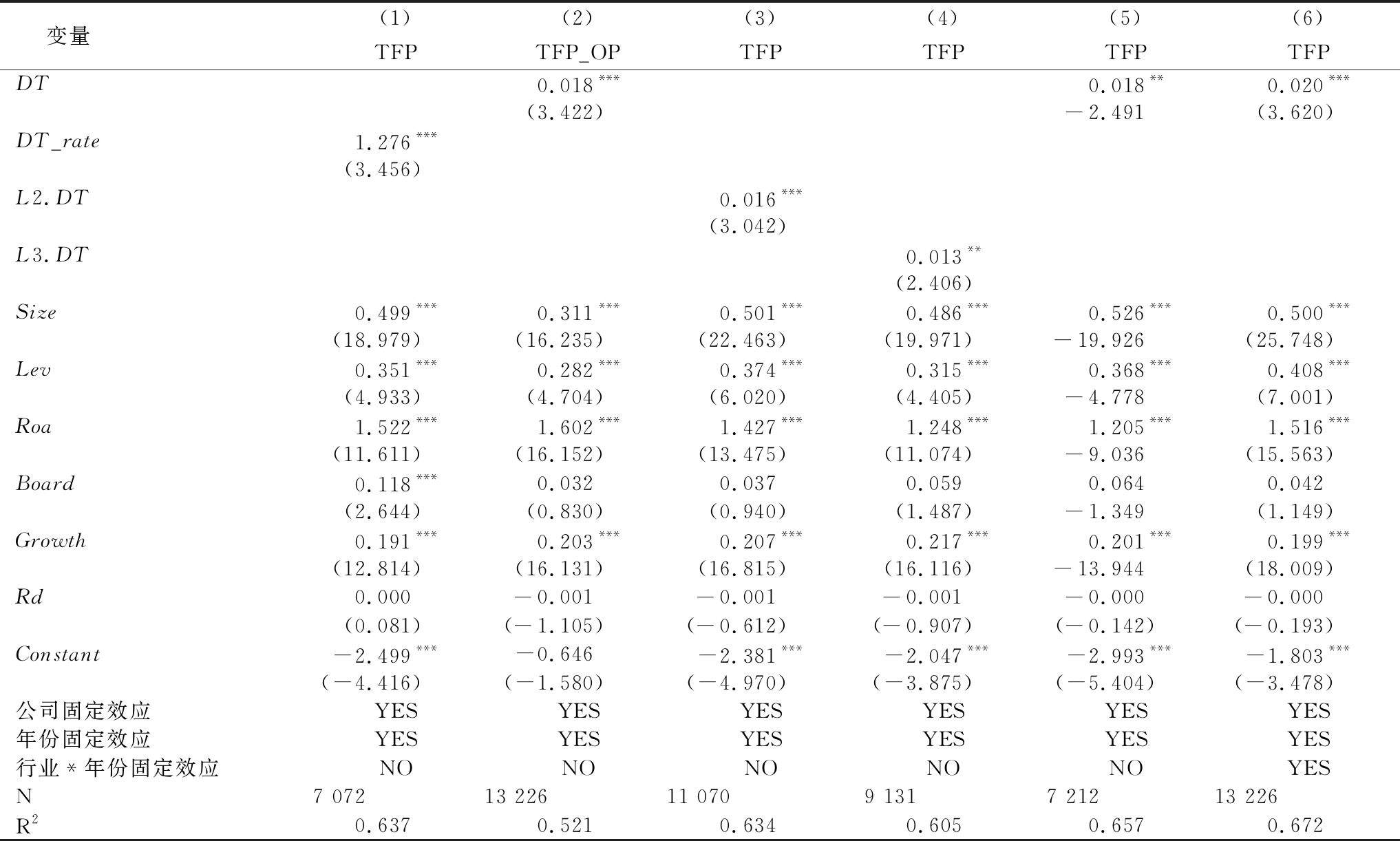 变量(1)(2)(3)(4)(5)(6)TFPTFP_OPTFPTFPTFPTFPDT0.018***0.018**0.020***(3.422)-2.491(3.620)DT_rate1.276***(3.456)L2.DT0.016***(3.042)L3.DT0.013**(2.406)Size0.499***0.311***0.501***0.486***0.526***0.500***(18.979)(16.235)(22.463)(19.971)-19.926(25.748)Lev0.351***0.282***0.374***0.315***0.368***0.408***(4.933)(4.704)(6.020)(4.405)-4.778(7.001)Roa1.522***1.602***1.427***1.248***1.205***1.516***(11.611)(16.152)(13.475)(11.074)-9.036(15.563)Board0.118***0.0320.0370.0590.0640.042(2.644)(0.830)(0.940)(1.487)-1.349(1.149)Growth0.191***0.203***0.207***0.217***0.201***0.199***(12.814)(16.131)(16.815)(16.116)-13.944(18.009)Rd0.000-0.001-0.001-0.001-0.000-0.000(0.081)(-1.105)(-0.612)(-0.907)(-0.142)(-0.193)Constant-2.499***-0.646-2.381***-2.047***-2.993***-1.803***(-4.416)(-1.580)(-4.970)(-3.875)(-5.404)(-3.478)公司固定效应YESYESYESYESYESYES年份固定效应YESYESYESYESYESYES行业*年份固定效应NONONONONOYESN7 07213 22611 0709 1317 21213 226R20.6370.5210.6340.6050.6570.672