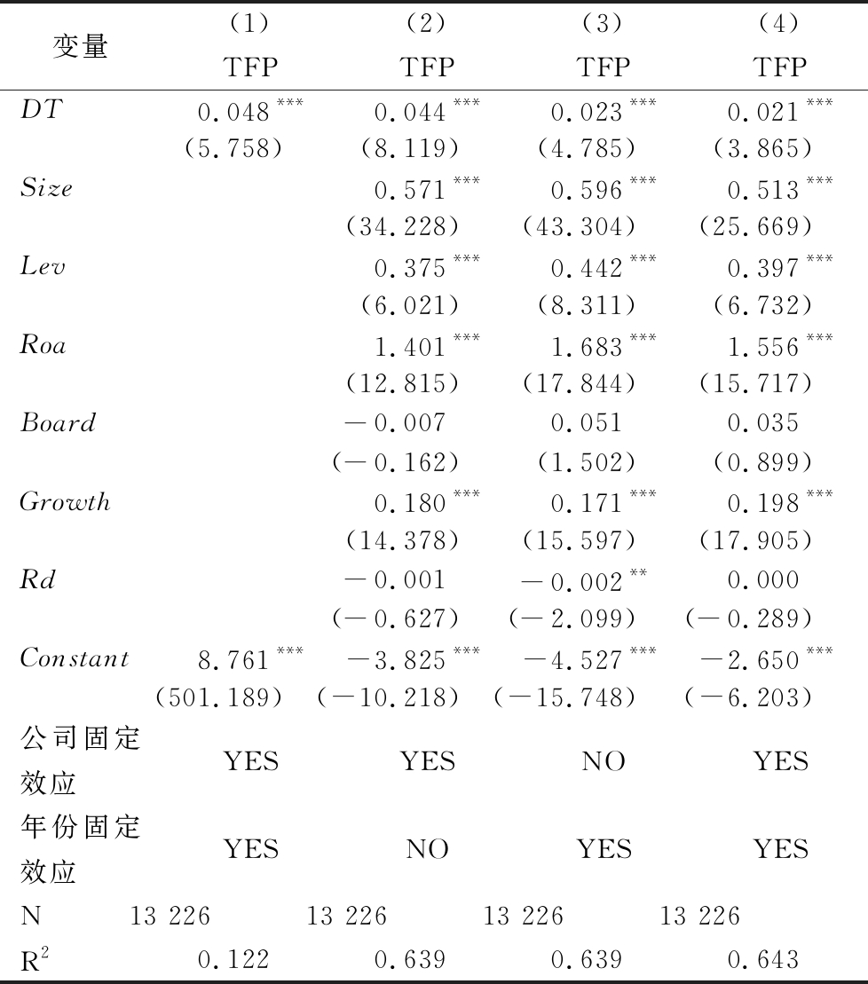 变量(1)(2)(3)(4)TFPTFPTFPTFPDT0.048***0.044***0.023***0.021***(5.758)(8.119)(4.785)(3.865)Size0.571***0.596***0.513***(34.228)(43.304)(25.669)Lev0.375***0.442***0.397***(6.021)(8.311)(6.732)Roa1.401***1.683***1.556***(12.815)(17.844)(15.717)Board-0.0070.0510.035(-0.162)(1.502)(0.899)Growth0.180***0.171***0.198***(14.378)(15.597)(17.905)Rd-0.001-0.002**0.000(-0.627)(-2.099)(-0.289)Constant8.761***-3.825***-4.527***-2.650***(501.189)(-10.218)(-15.748)(-6.203)公司固定效应YESYESNOYES年份固定效应YESNOYESYESN13 22613 22613 22613 226R20.1220.6390.6390.643
