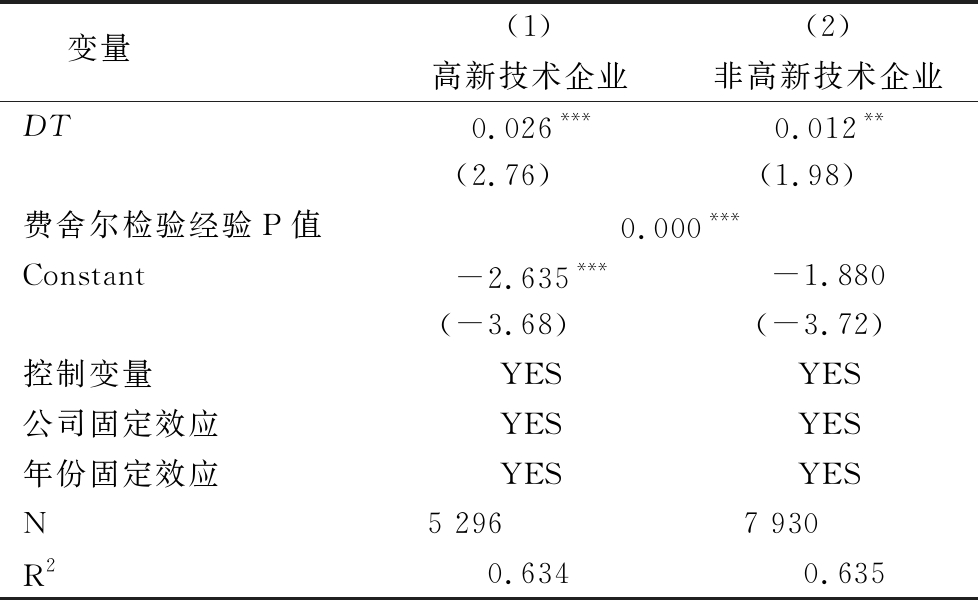 变量(1)(2)高新技术企业非高新技术企业DT0.026***0.012**(2.76)(1.98)费舍尔检验经验P值0.000***Constant-2.635***-1.880(-3.68)(-3.72)控制变量YESYES公司固定效应YESYES年份固定效应YESYESN5 2967 930R20.6340.635