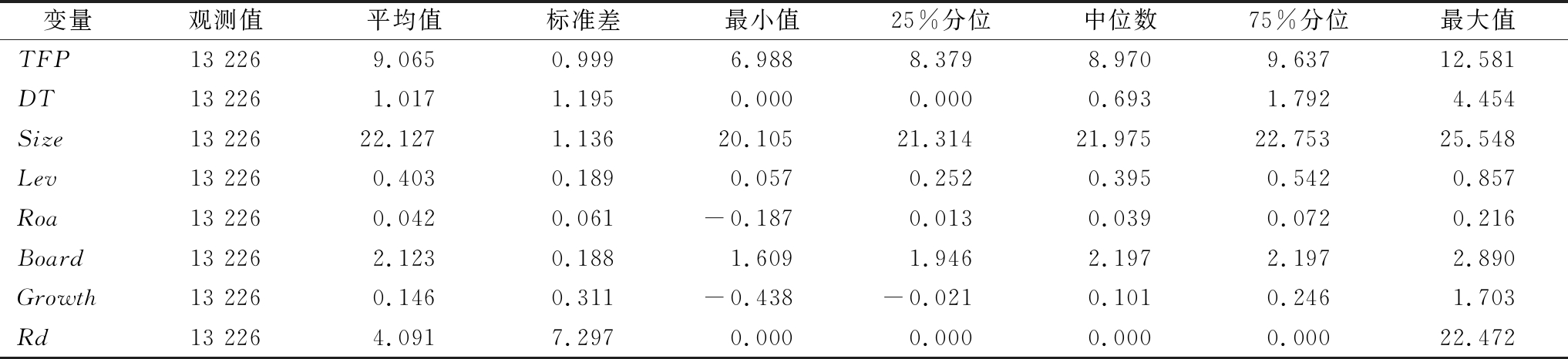本文主要变量描述性统计结果如表2所示。由表2可知,企业全要素生产率(TFP)的中位数是8.970,平均值是9.065,标准差为0.999,说明企业全要素生产率不存在过度分散问题,且分布形态近似于正态分布。数字化转型(DT)在25%分位处的值为0,中位数为0.693,最大值为4.454。由此可知,部分制造企业尚未开始实施数字化转型,至少50%的样本企业已实施数字化转型,说明制造企业数字化转型水平亟待提高。同时,变量DT的离散系数(标准差/平均值)大于1,说明不同样本企业数字化转型程度具有较大差异。研发费用(Rd)在75%分位处的值为0,最大值为22.472,离散系数大于1,说明不同样本企业研发费投入两极分化严重,且分布形态呈典型右偏。参考以往研究文献可以发现,其余变量统计值分布均在合理范围内。
