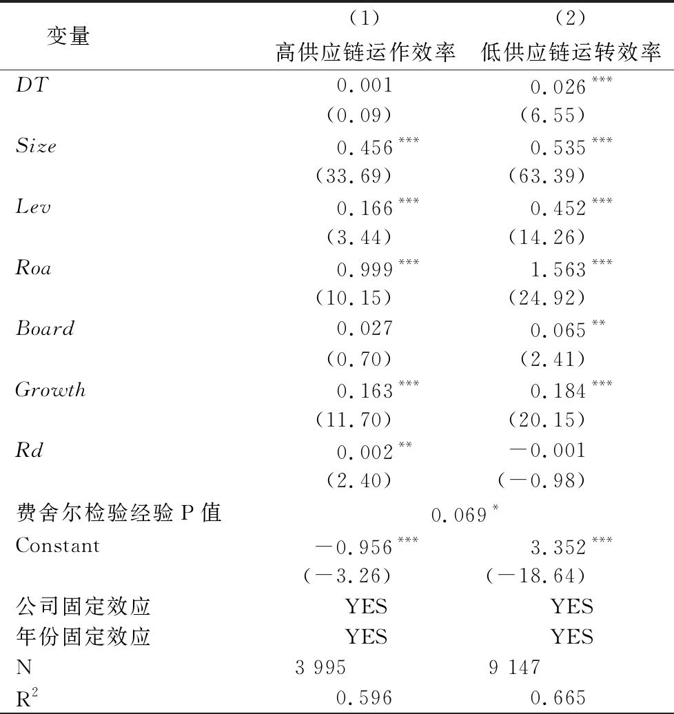 变量(1)(2)高供应链运作效率低供应链运转效率DT0.0010.026***(0.09)(6.55)Size0.456***0.535***(33.69)(63.39)Lev0.166***0.452***(3.44)(14.26)Roa0.999***1.563***(10.15)(24.92)Board0.0270.065**(0.70)(2.41)Growth0.163***0.184***(11.70)(20.15)Rd0.002**-0.001(2.40)(-0.98)费舍尔检验经验P值0.069*Constant-0.956***3.352***(-3.26)(-18.64)公司固定效应YESYES年份固定效应YESYESN3 9959 147R20.5960.665
