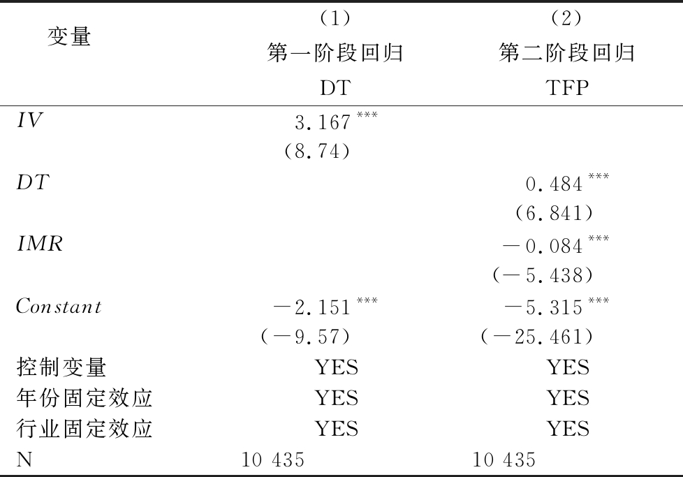 变量(1)(2)第一阶段回归第二阶段回归DTTFPIV3.167***(8.74)DT0.484***(6.841)IMR-0.084***(-5.438)Constant-2.151***-5.315***(-9.57)(-25.461)控制变量YESYES年份固定效应YESYES行业固定效应YESYESN10 43510 435
