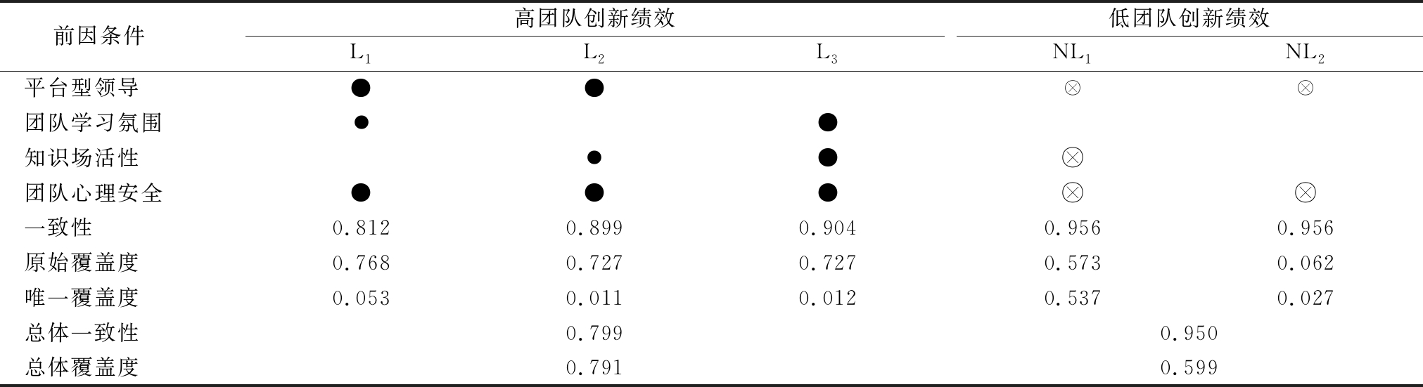 鉴于QCA方法具有因果非对称性的特点[25],高团队创新绩效前因组态的相反状态未必是低团队创新绩效的前因组态,因此,有必要对低团队创新绩效的前因组态作进一步确认。如表8所示,导致低团队创新绩效的两种前因组态NL1和NL2,其一致性均为0.956,总体一致性为0.950,均超过0.75的最低标准[27],说明这两种组态分别构成低团队创新绩效的充分条件。这两条路径解释了59.9%的低团队创新绩效样本。由NL1和NL2可知,当团队中同时出现知识场活性低迷、团队心理安全感缺乏、平台型领导缺失,或同时出现团队学习氛围不足、团队心理安全水平较低、平台型领导缺失时,就会导致低团队创新绩效。在以低团队创新绩效为结果条件的前因组态中,未出现平台型领导、团队学习氛围、知识场活性和团队心理安全等因素,进一步佐证了变量间存在正向关系。