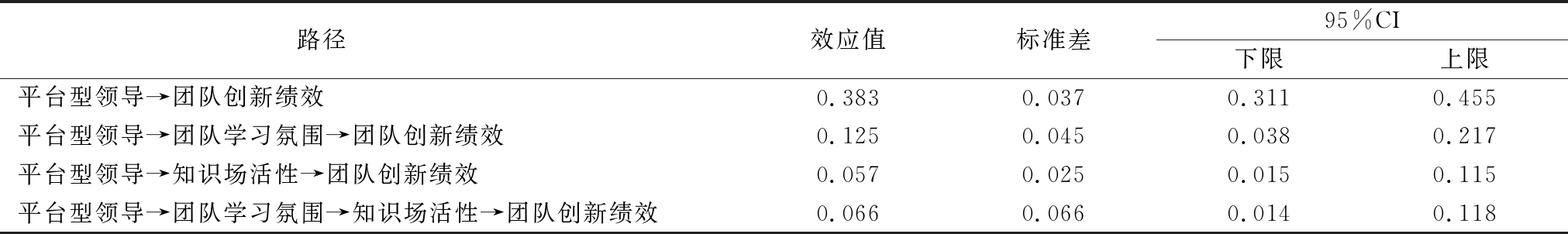 采用SPSS中的Process 4.1宏程序对各变量间直接效应进行检验,并采用Bootstrap法重复抽样5 000次,对主效应及中介效应进行检验,结果如图2和表5所示。由图2的路径分析结果可知,控制人口统计学变量后,平台型领导对团队学习氛围(β=0.518,p<0.001)、知识场活性(β=0.251,p<0.001)、团队创新绩效(β=0.383,p<0.001)存在显著正向影响;团队学习氛围(β=0.241,p<0.001)、知识场活性(β=0.227,p<0.001)对团队创新绩效具有显著正向影响;团队学习氛围显著正向影响知识场活性(β=0.561,p<0.001)。由表5的中介效应检验结果可知,团队学习氛围(β=0.125,p<0.05)、知识场活性(β=0.057,p<0.05)在平台型领导与团队创新绩效之间的中介效应显著,且95% CI分别为[0.038,0.217]和[0.015,0.115],均不包含0。团队学习氛围和知识场活性在平台型领导与团队创新绩效之间的链式中介作用也显著(β=0.066,p<0.05),95% CI为[0.014,0.118],不包含0。因此,假设H1-H4均得到支持。