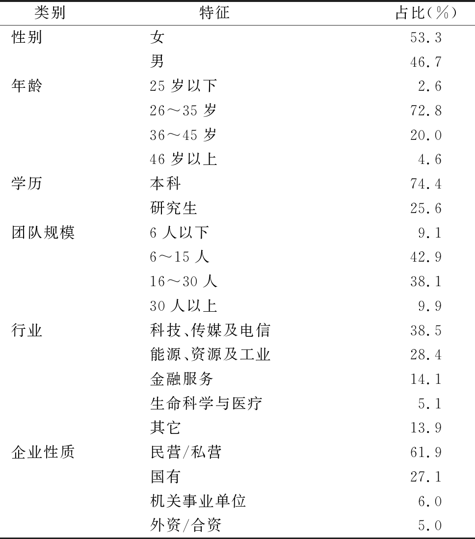 类别特征 占比(%)性别女53.3男46.7年龄25岁以下2.626^35岁72.836^45岁20.046岁以上4.6学历本科74.4研究生25.6团队规模6人以下9.16^15人42.916^30人38.130人以上9.9行业科技、传媒及电信38.5能源、资源及工业28.4金融服务14.1生命科学与医疗5.1其它13.9企业性质民营/私营61.9国有27.1机关事业单位6.0外资/合资5.0