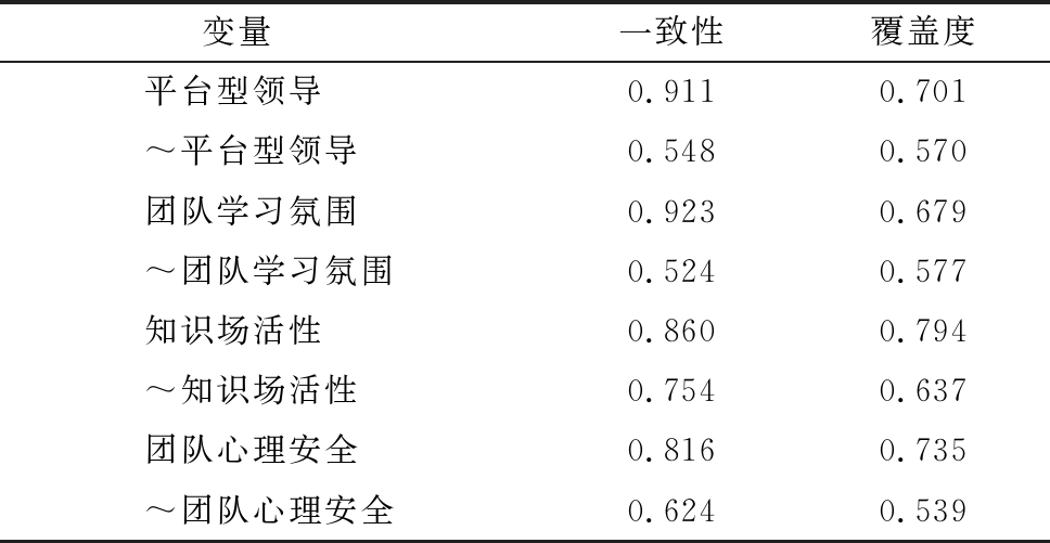 在变量校准的基础上,对团队创新绩效的前因条件进行必要性分析,结果如表7所示。除平台型领导和团队学习氛围外,其它全部前因条件的一致性分数均小于0.9,说明这些因素不构成高团队创新绩效的必要条件。此外,根据张明等[25]的建议,直接使用必要条件集合与结果集合之间的X-Y散点图对前因条件的必要性进行判断,若大部分样本点分布在对角线以下,则认为该必要条件无关紧要。本研究分别绘制平台型领导、团队学习氛围与团队创新绩效之间的X-Y散点图,可以发现,两幅图均有约1/2的样本点分布在对角线以下(限于篇幅,未在文中展示)。因此,团队创新绩效的各前因条件均不单独构成其必要条件,需要对多个前因条件组合进行组态分析。