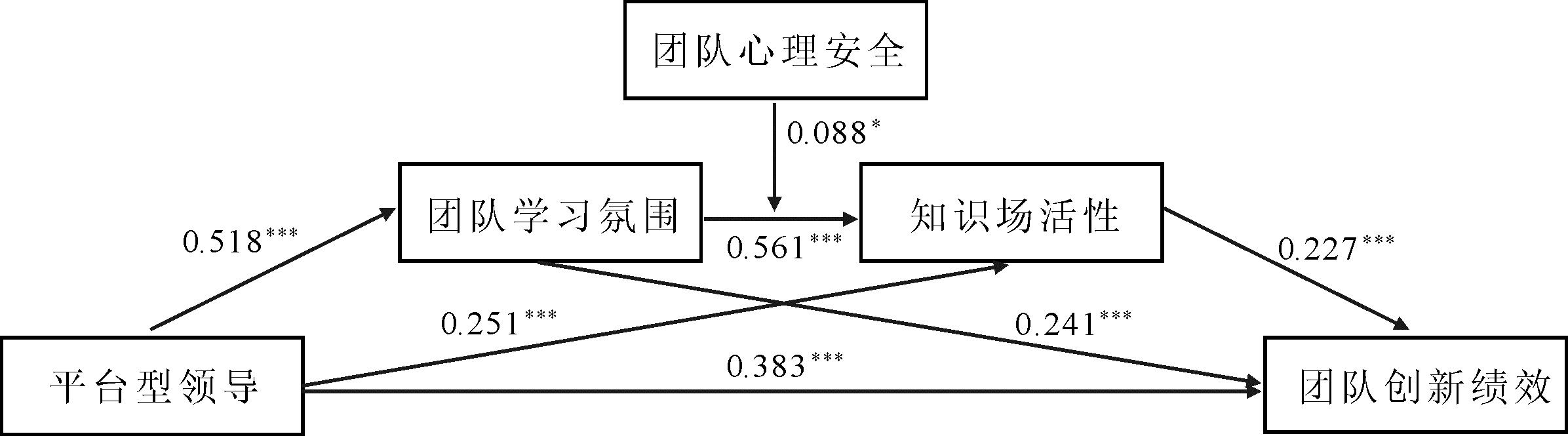 各变量均值、标准差及变量间相关系数如表3所示。平台型领导与团队学习氛围(r=0.596,p<0.01)、知识场活性(r=0.645,p<0.01)、团队心理安全(r=0.741,p<0.01)、团队创新绩效(r=0.699,p<0.01)均显著正相关;团队学习氛围与知识场活性(r=0.761,p<0.01)、团队心理安全(r=0.552,p<0.01)、团队创新绩效(r=0.661,p<0.01)均显著正相关;知识场活性与团队心理安全(r=0.558,p<0.01)、团队创新绩效(r=0.677,p<0.01)均显著正相关;团队心理安全与团队创新绩效(r=0.623,p<0.01)显著正相关。以上结果为验证相关假设提供了初步支持。