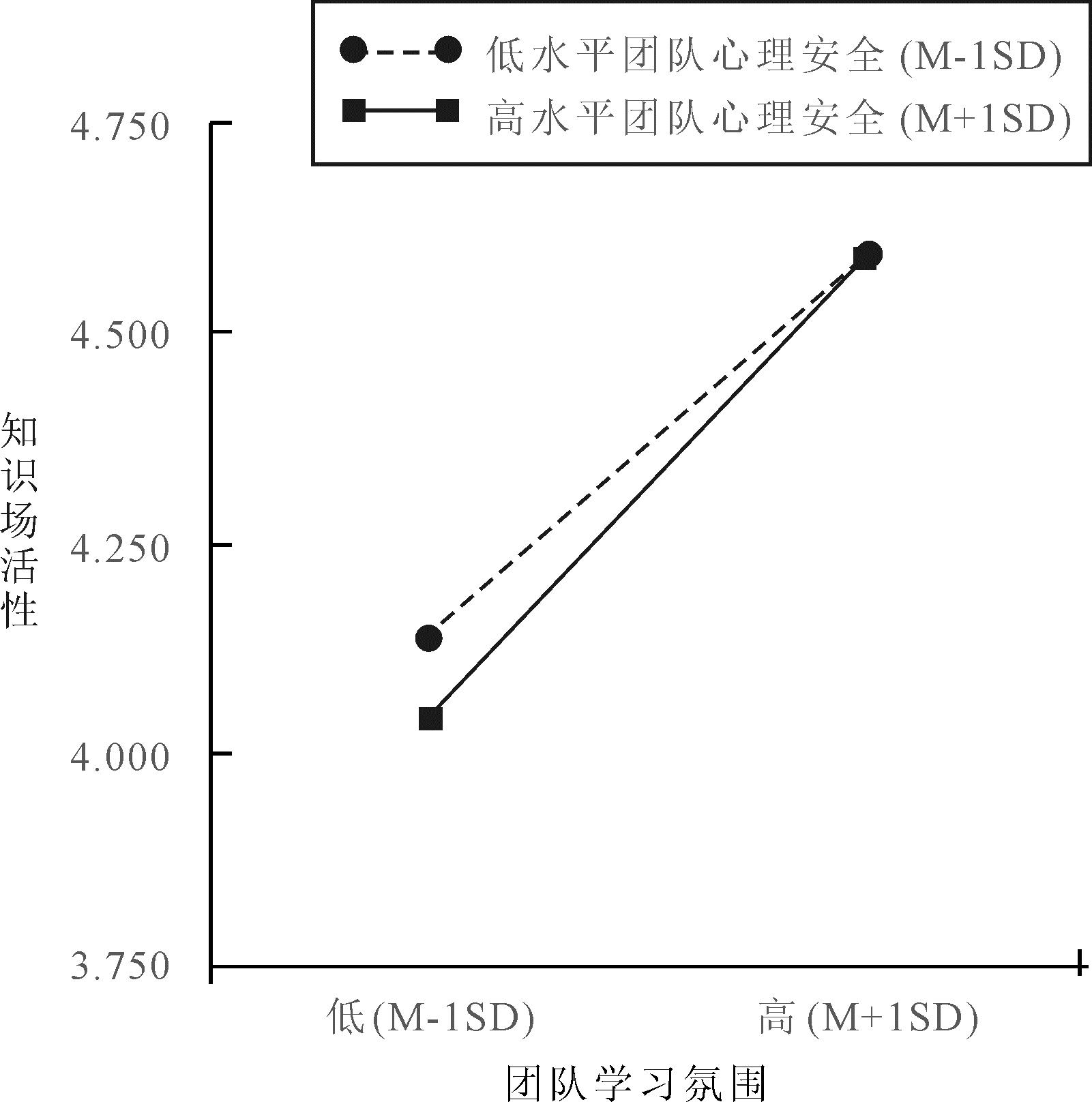 高水平团队心理安全下,持不同观点的团队成员能够直接表达自己的想法,而不必担心由此带来的不利影响[22]。在一定水平团队学习氛围下,成员共享知识的意愿更高,并且敢于发表与他人不同的观点和看法,这有利于团队更大限度吸收和整合各类信息资源,从而提高知识场活性。反之,低水平团队心理安全下,团队成员担心发表与他人不同的想法或观点会使自己在团队中的地位受到威胁,尽管其认同团队学习氛围,也可能出于自身利益而有所保留,不敢全面参与团队成员间信息交流,从而降低知识场活性。由此,本文提出如下假设: