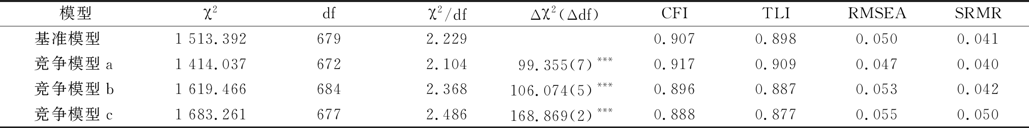 模型 χ2 df χ2/df Δχ2 (Δdf) CFI TLI RMSEA SRMR基准模型1 513.3926792.2290.9070.8980.0500.041竞争模型a1 414.0376722.10499.355(7)***0.9170.9090.0470.040竞争模型b1 619.4666842.368106.074(5)***0.8960.8870.0530.042竞争模型c1 683.2616772.486168.869(2)***0.8880.8770.0550.050