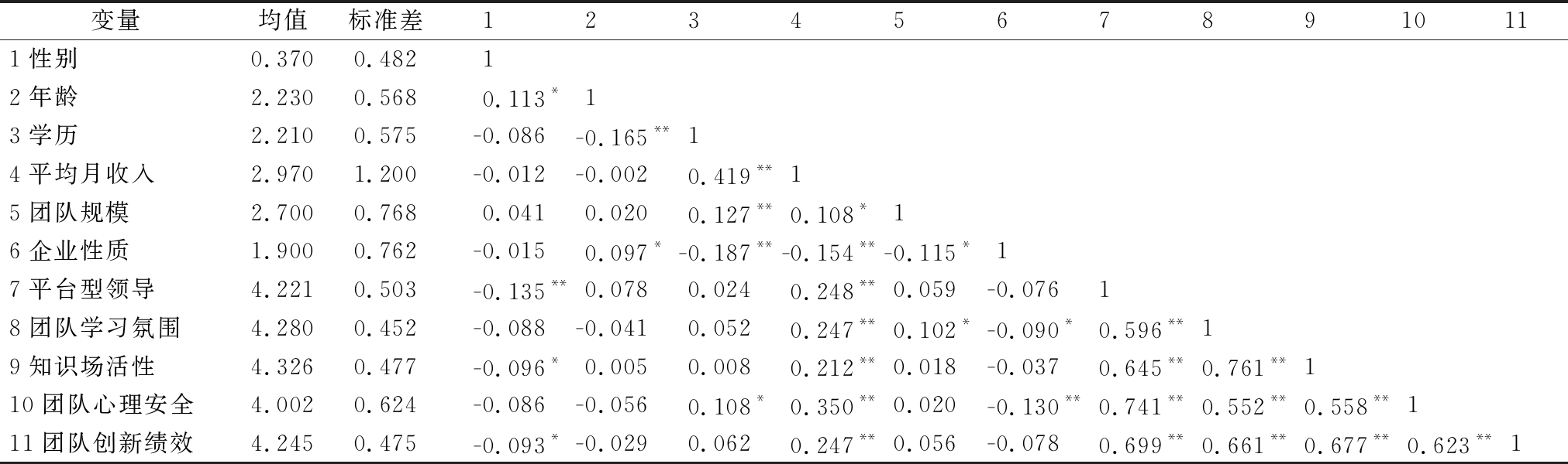 变量均值标准差12345678910111性别0.3700.48212年龄2.2300.5680.113*13学历2.2100.575-0.086-0.165**14平均月收入2.9701.200-0.012-0.0020.419**15团队规模2.7000.7680.0410.0200.127**0.108*16企业性质1.9000.762-0.0150.097*-0.187**-0.154**-0.115*17平台型领导4.2210.503-0.135**0.0780.0240.248**0.059-0.07618团队学习氛围4.2800.452-0.088-0.0410.0520.247**0.102*-0.090*0.596**19知识场活性4.3260.477-0.096*0.0050.0080.212**0.018-0.0370.645**0.761**110团队心理安全4.0020.624-0.086-0.0560.108*0.350**0.020-0.130**0.741**0.552**0.558**111团队创新绩效4.2450.475-0.093*-0.0290.0620.247**0.056-0.0780.699**0.661**0.677**0.623**1