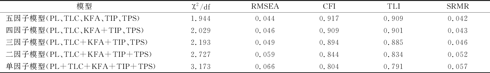 模型χ2/dfRMSEACFITLISRMR五因子模型(PL、TLC、KFA、TIP、TPS)1.9440.0440.9170.9090.042四因子模型(PL、TLC、KFA+TIP、TPS)2.0290.0460.9090.9010.043三因子模型(PL、TLC+KFA+TIP、TPS)2.1930.0490.8940.8850.046二因子模型(PL、TLC+KFA+TIP+TPS)2.7270.0590.8440.8340.052单因子模型(PL+TLC+KFA+TIP+TPS)3.1730.0660.8040.7910.057
